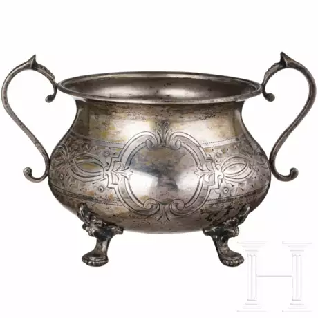 Silber. Auf vier Füßen mit plastischer Blattzier. Wandung umlaufend mit graviertem Blatt- und Blütenwerk verziert. Seitlich zwei geschwungene Handhaben. Punziert mit Beschauzeichen und Meistermarke "TB". Maße 10,5 x 17 x 12 cm, Gewicht 347 g.