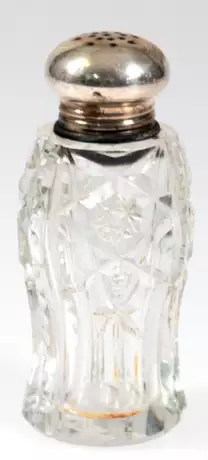 Lot 693 | Zuckerstreuer, geschliffener Kristallkorpus mit 800er Silbermontur, H. 12,5 cm
