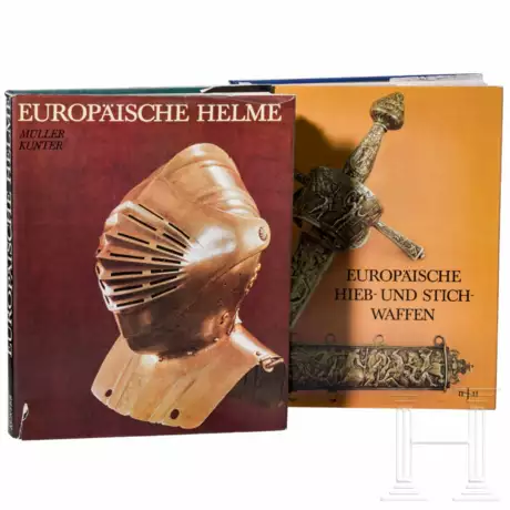 Jeweils im goldgeprägten Leineneinband mit Schutzumschlag (bei einem Exemplar angerissen). (1) Müller, Heinrich: Europäische Helme. Aus der Sammlung des Museums für Deutsche Geschichte. Berlin 1984. Reich bebilderte Geschichte des europäischen Helmes von der Antike bis zur Gegenwart auf 314 Seiten. (2) Müller, Heinrich; Kölling, Hartmut: Europäische Hieb- und Stichwaffen. Aus der Sammlung des Museums für Deutsche Geschichte. Berlin 1981. 448 Seiten, im Schuber, mit ausführlichem Anhang zur Erklärung der Fachbegriffe sowie einem Beschreibungskatalog inkl. tabellarischer Erfassung von Marken.