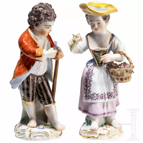 Porzellan, farbig bemalt, partiell goldstaffiert. Gärtnerkind mit Spaten, Schwertermarke 1. Wahl, Nr. "60346", "12FE". Höhe 12,2 cm. Gärtnerkind mit Blumenkorb und Strauß, Schwertermarke 1. Wahl, Nr. "60347", "23". Höhe 12,5 cm.