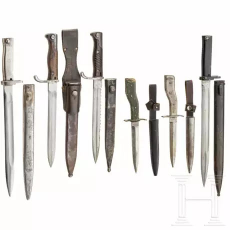 Gekürztes Bajonett 98/05 mit Sägerückenklinge (Mauser-Stempel, Abnahme "W 17"), Eisengefäß, Holzgriffschalen und Eisenscheide. Dazu ein ähnliches Exemplar ohne Säge, mit gleichen Klingenstempeln, in Eisenscheide mit Leder-Koppelschuh. Zwei Ganzmetall-Ersatzbajonette mit Eisenscheiden, die Oberflächen von Griffen und Scheiden narbig, ein Exemplar schwarz nachlackiert. Zwei DEMAG-Grabendolche mit entsprechenden Klingenmarken (teils verputzt), ein Exemplar in ergänzter blanker Eisenscheide (nicht passend), das andere Exemplar nachlackiert. Arretierungen intakt. Teilweise leicht beschädigt, Altersspuren. Länge ca. 28 - 46 cm.