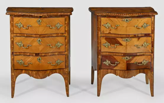 Pflaumenholz bzw. Nussbaum, furniert. Hochrechteckiger, bombierter Korpus, flankiert von schmalen, gerundeten Ecklisenen, in korrespondierende Beine übergehend. In der gegliederten Front drei Schubladen. Gering überstehende Deckplatte mit jeweils unterschiedlichen Rautenfeldern. Flächendeckend gespiegelt angeordnete, variierende Furnierfelder. Rücks. je bez. "S.28". H. 78 cm. 64 cm x 39,5 cm bzw. H. 78 cm. 66 cm x 39,5 cm.