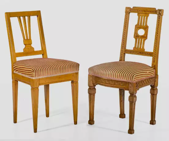 Nuss- bzw. Kirschbaum. Trapezförmige Zarge auf balusterförmigen bzw. konischen Beinen. Rechteckige Rückenlehnenrahmung mit durchbrochen gearbeitetem Mittelsteg. Sitzfläche gepolstert und bezogen. Sitz-H. 51 cm.