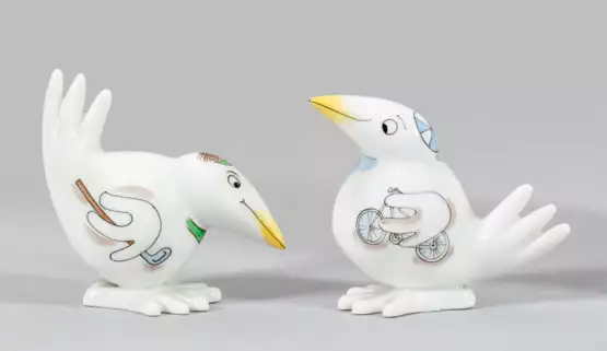 Two porcelain figures from the series "funny birds" representing a cyclist and a golfer. Crossed swords mark.