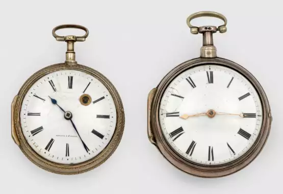 London, um 1813, bzw. Frankreich, Anfang 19. Jh.; Silber. Glattes Uhrengehäuse, teilw. mit fein ornamentierter Lünette, weißes Emailzifferblatt mit Stabindexen (Haarrisse) und vergoldeten bzw. gebläuten Birnenzeigern. Mechanisches Werk mit Schlüsselaufzug. Platine sign. "F. Strong, London" und "Ravoux à St. Flour"; D. 50 bis 55 mm. Ges. Gew. ca. 202,54 g.