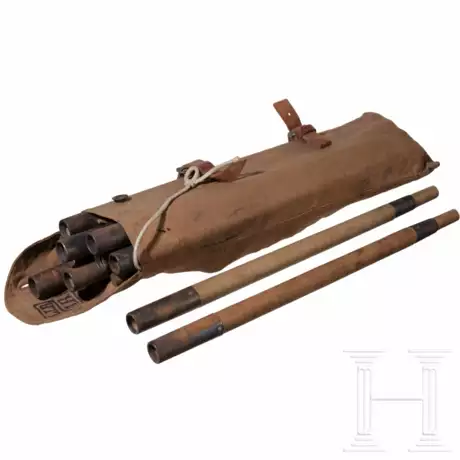 Zwölf zusammensteckbare Zeltstangen aus Holz mit brünierten Eisenbeschlägen (rostig). In Tasche aus feinem hellbraunen Leinentuch (ein Lederriemen abgerissen, ein Metallknopf fehlt), in der Verschlussklappe der Truppenstempel "1. I.R. / II. B. / 5. K.". Partiell leicht beschädigt, Altersspuren.