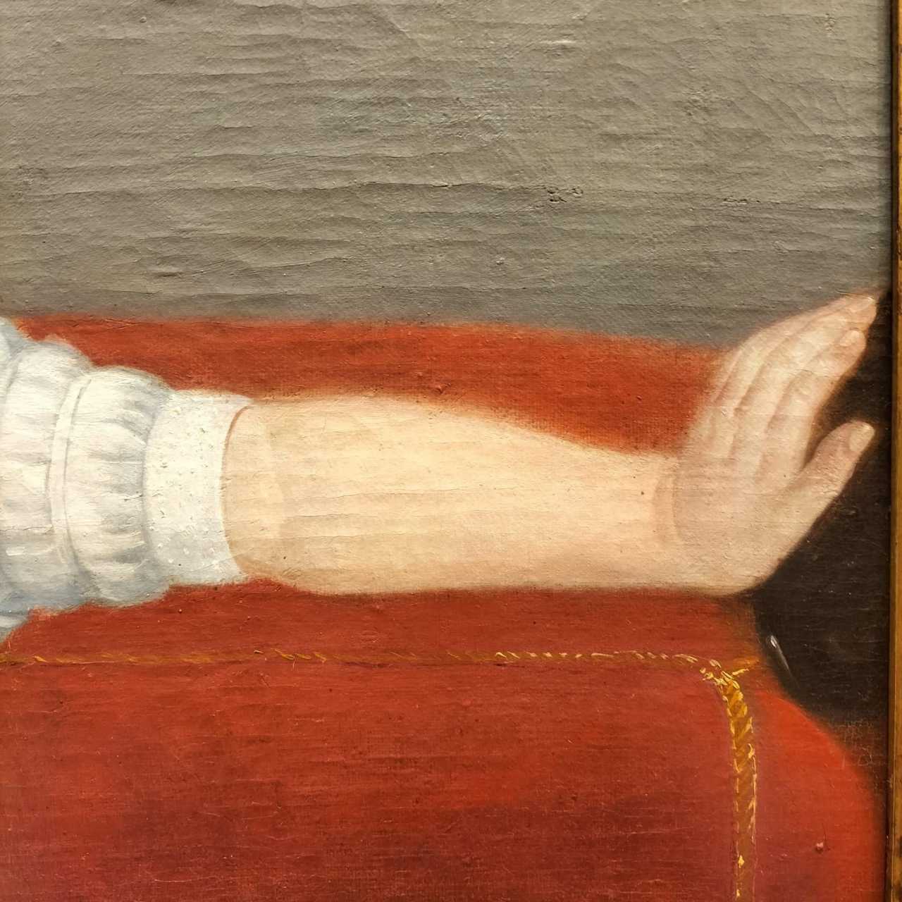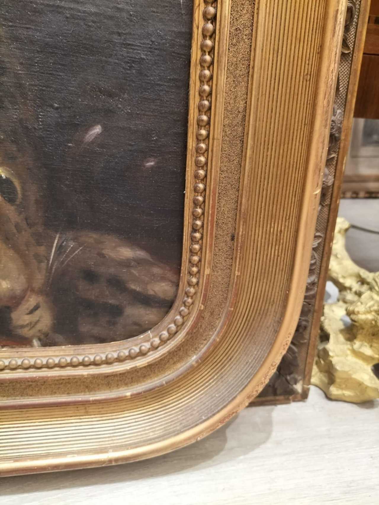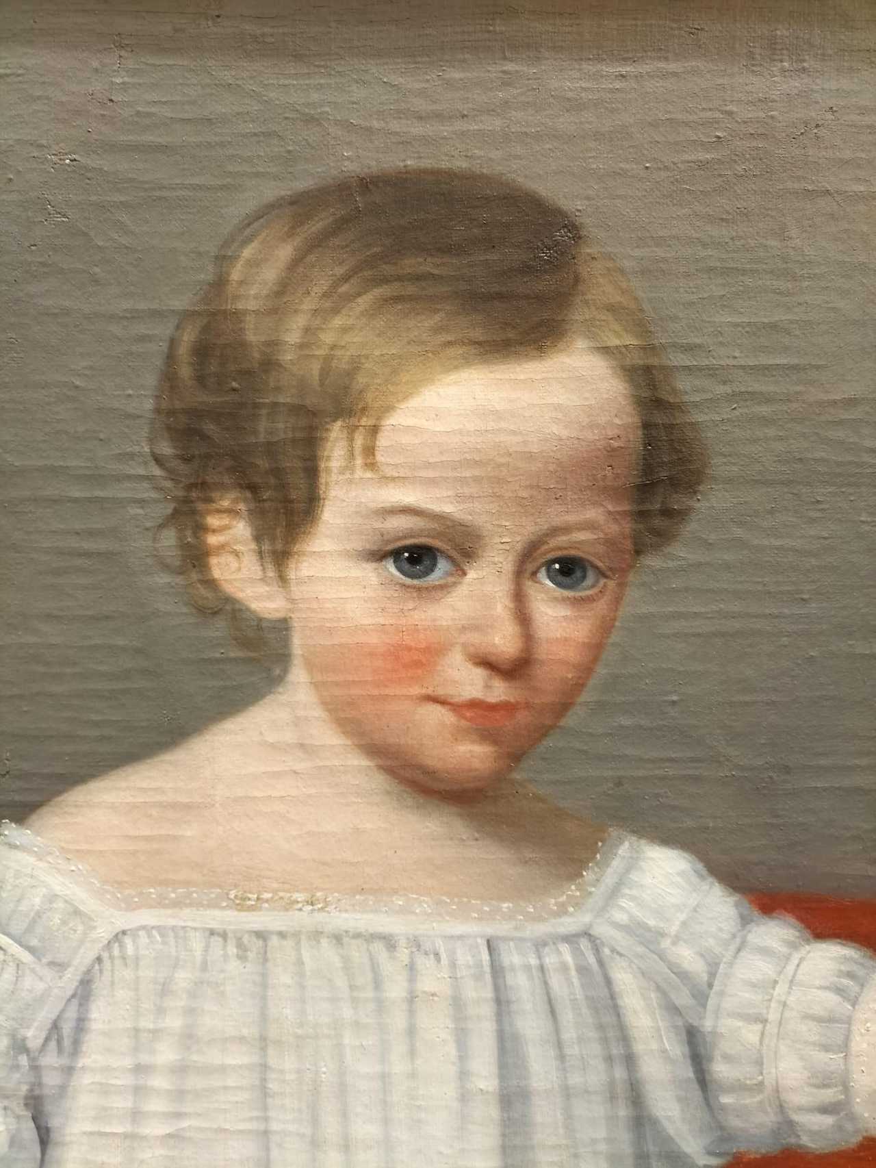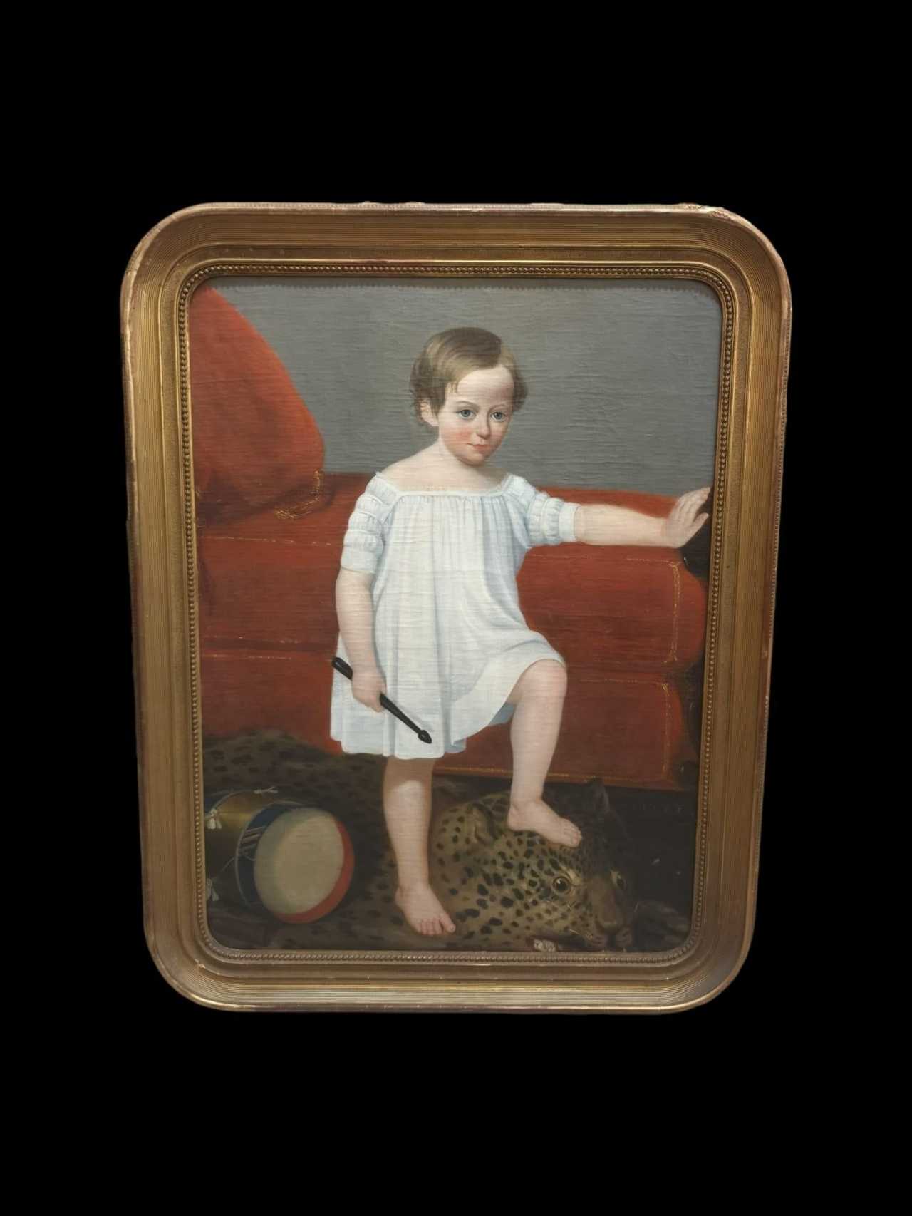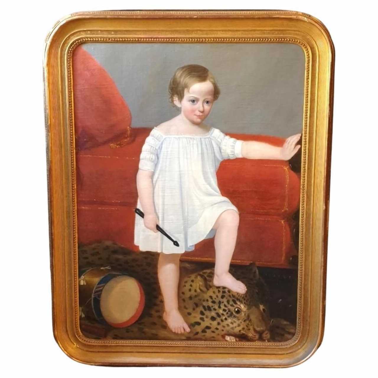 The child, at the center of the composition, is dressed in an immaculate white tunic that delicately falls over their shoulders and stops just above their knees. The simplicity of the tunic, devoid of excessive ornamentation, highlights the purity and innocence of childhood while adding a touch of grace and lightness to the scene.In their right hand, the child firmly holds a tambourine stick. This detail not only evokes an atmosphere of play and cheerfulness but also subtly alludes to antiquity, dear to artists of the Empire who often sought to blend classicism and modernity. The childs posture, captured in mid-motion, demonstrates a liveliness and spontaneity that make the scene even more authentic and touching.The child appears to walk confidently on a panther skin carefully laid out under their feet. The spotted and luxuriant texture of the skin sharply contrasts with the bright whiteness of the tunic, creating an interesting and sophisticated visual interplay. This luxurious element recalls the opulence and grandeur of the Empire era, where every detail is meticulously designed to evoke magnificence and splendor.The background of the painting is treated with artistic sensitivity that highlights the main subject without distracting from it. Soft shades and harmonious tones envelop the scene, creating a soothing and elegant atmosphere. The light seems to gently caress the childs features, accentuating the volumes and adding an almost tangible dimension to this timeless representation.Although unsigned, this painting from the Empire era delicately and finely captures a scene imbued with innocence and beauty. The attention to detail, mastery of textures and contrasts, and balanced composition testify to the artistic skill of the painters of that time, while offering a work full of charm and majesty.Dimensions with frame: 90x115 cm.