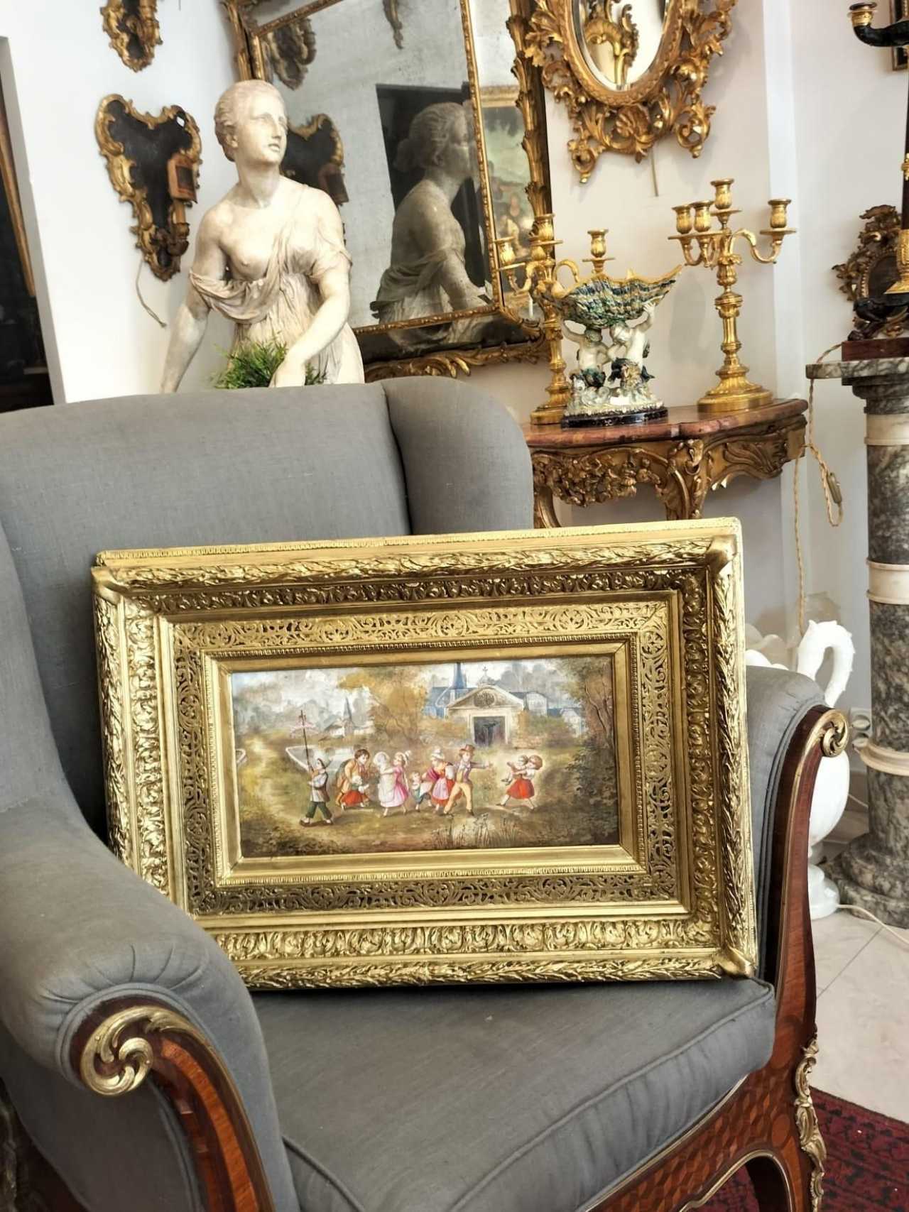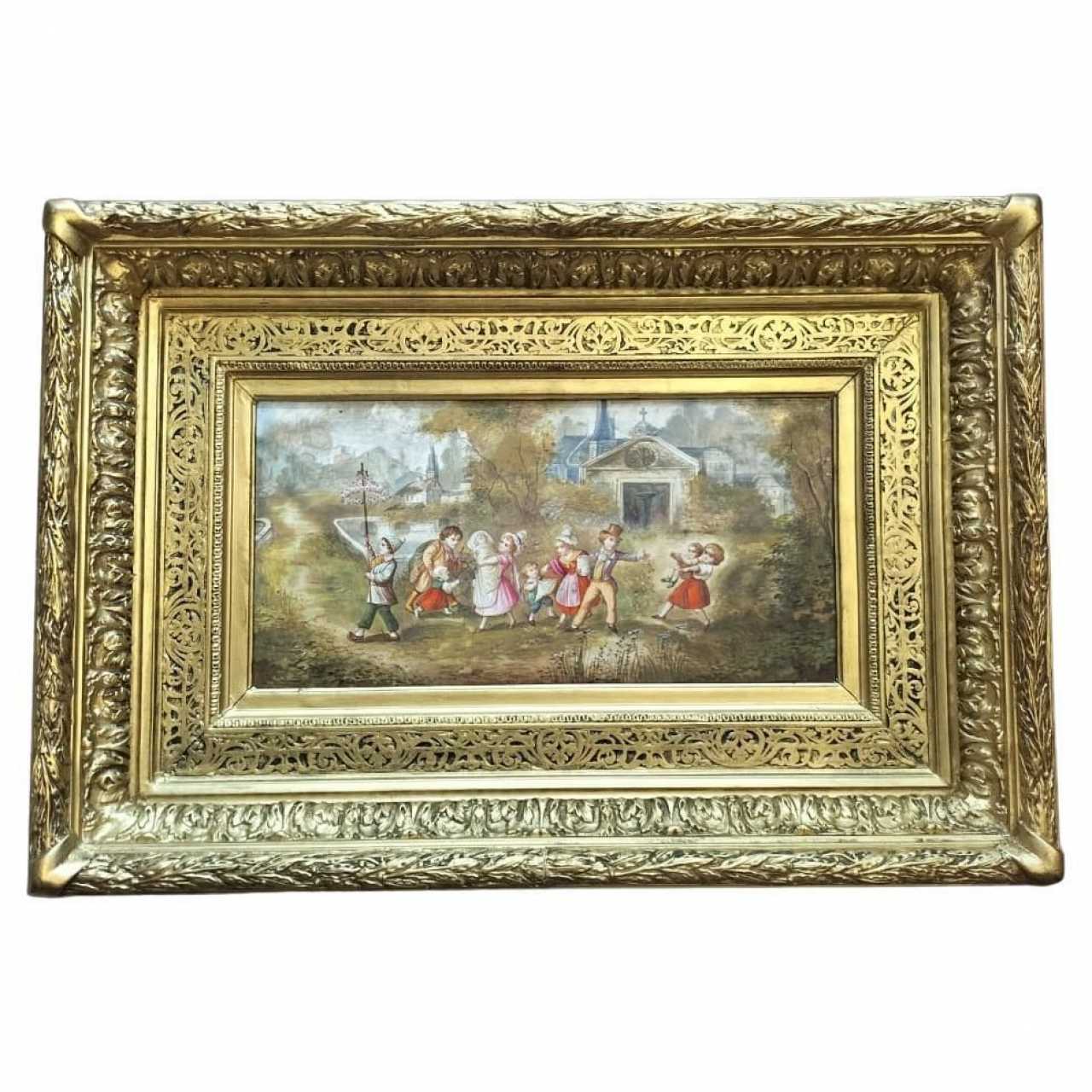 Beautiful and large painted porcelain plaque depicting a group of laughing characters in a village in a wooden and gilded stucco frame. Around 1880.Good condition ready to hang.