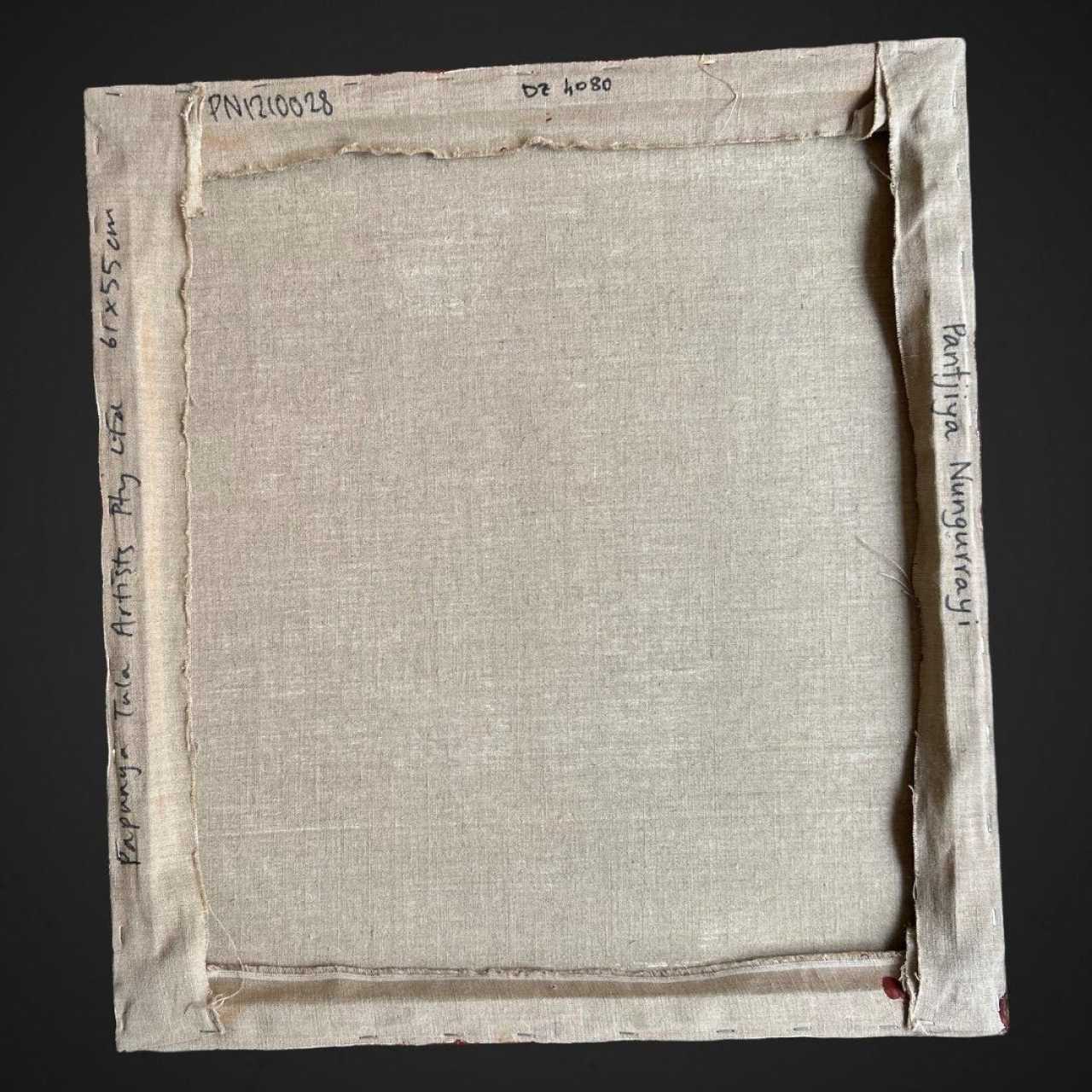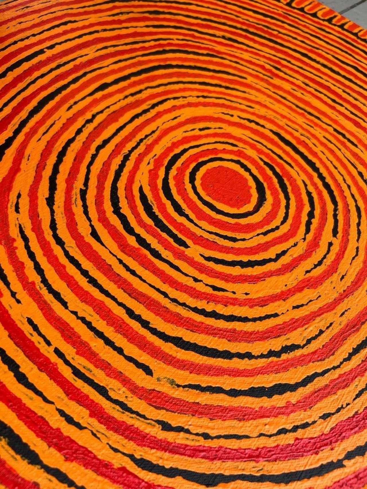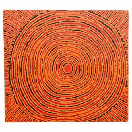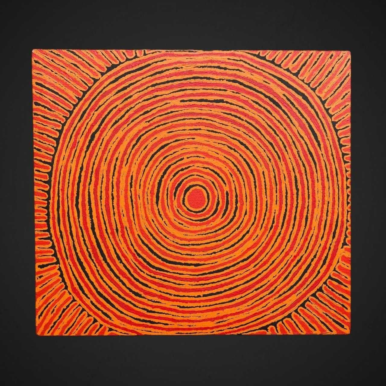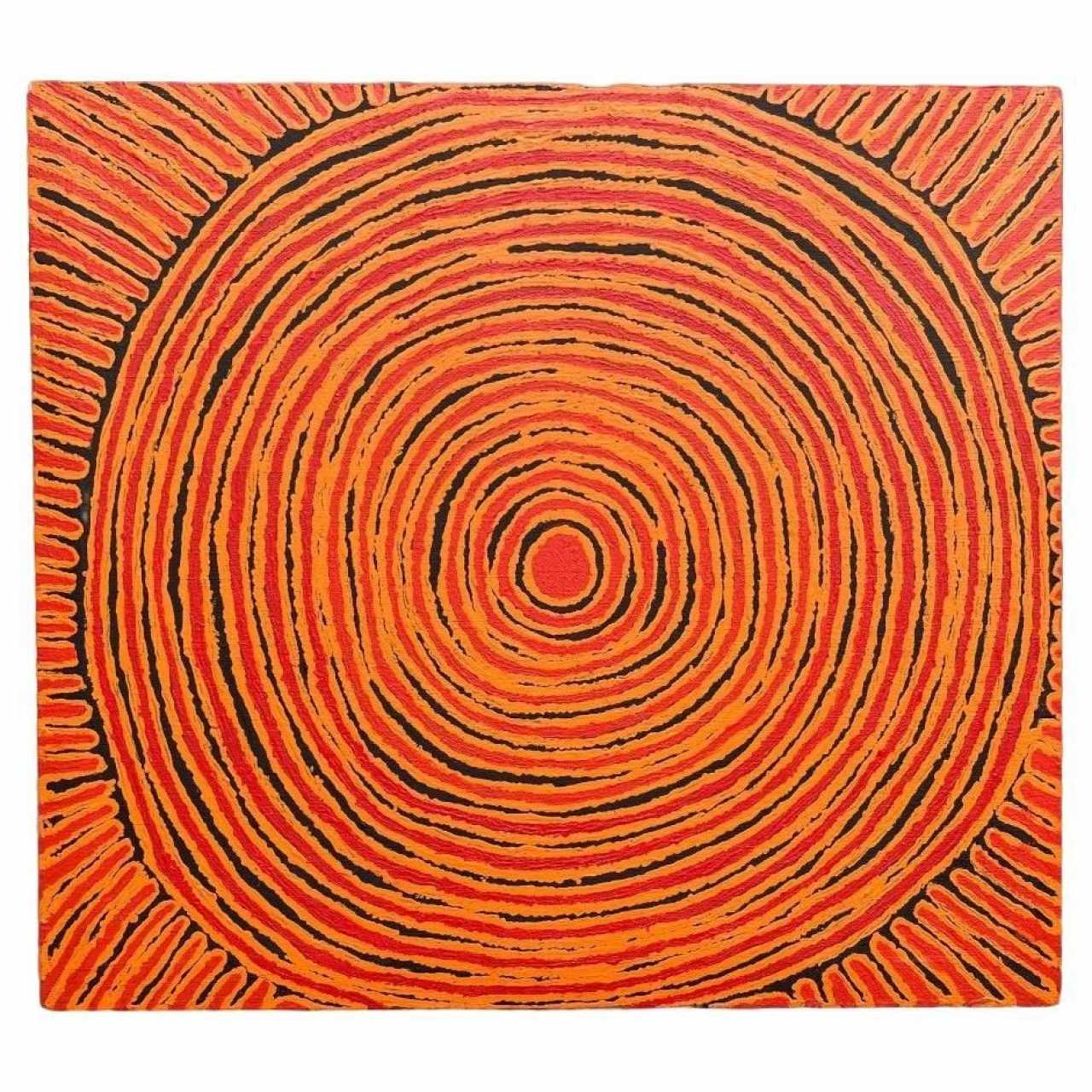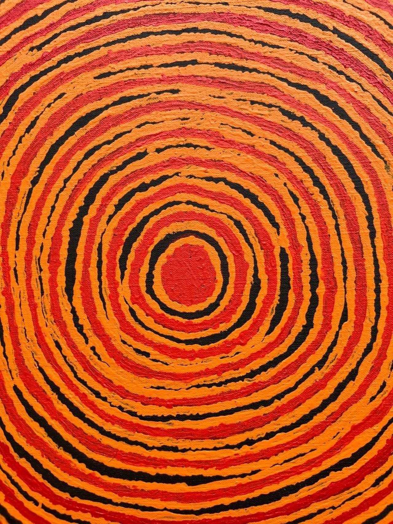 In this extraordinary painting, Pantjiya Nungurrayi celebrates, using a three-colour palette, the sites for which she holds ritual guardianship. In this instance, she portrays Ngutjul, a sacred waterhole where, in the Dreamtime, a group of women established a camp. The canvas, structured with concentric circles, depicts the site as viewed from above. The artwork originates from the Papunya Tula art center and dates back to 2010. A certificate of authenticity will be provided to the buyer.Pantjiya Nungurrayi was born around 1936, in the desert near Haasts Bluff. Her half-brother is Shorty Lungkata, one of the significant artists involved in the creation of the Aboriginal art movement. Pantjiya recalls her nomadic life and receiving food rations from white people travelling through the desert on camels. She married George Tjangala, and in the 1960s, the family moved to Papunya, where the artistic movement would begin in 1971. Her husband likely painted a few canvases from the early 1970s (some uncertainties arise due to name changes and some individuals having multiple names). He continued painting until his death in 1989. During the final months of his life, Pantjiya likely assisted him in the pointillist technique. However, women only had the opportunity to paint from 1994 onwards in a joint project between artists from Haasts Bluff and those from the Western Desert, when they gained access to painting. Two years later, the cooperative finally provided an opportunity for women. Pantjiya waited until 1997 to paint a few small formats, and after several months, she enthusiastically launched herself into the artistic adventure. She would establish herself as one of the significant artists from the Western Desert.