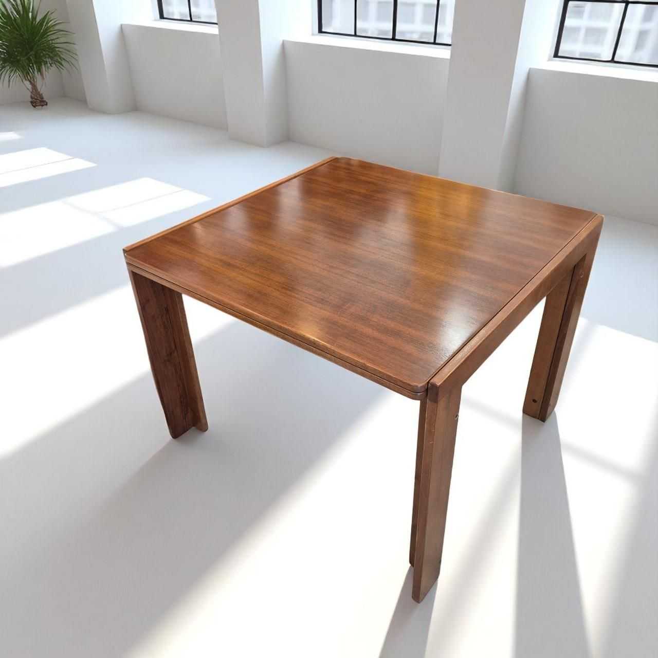 A rare example of mid-century Italian design, this folding dining table (Model 778) was designed by Afra & Tobia Scarpa for Cassina in the late 1960s. Renowned for their seamless blend of architectural rigor and warm materiality, the Scarpas created a versatile piece that exemplifies their elegant, utilitarian approach to furniture design.Crafted from solid hardwood with a rich, warm finish, the table features a unique folding mechanism that allows it to transition from a compact square form to a full-sized dining table. The top unfolds via precision brass hinges to reveal an internal leaf, extending the table’s length effortlessly. Clean lines, minimal joinery, and robust proportions showcase the Scarpas attention to detail and timeless aesthetic.Perfect for modern interiors where both style and function matter, this table serves equally well in dining, office, or studio spaces.