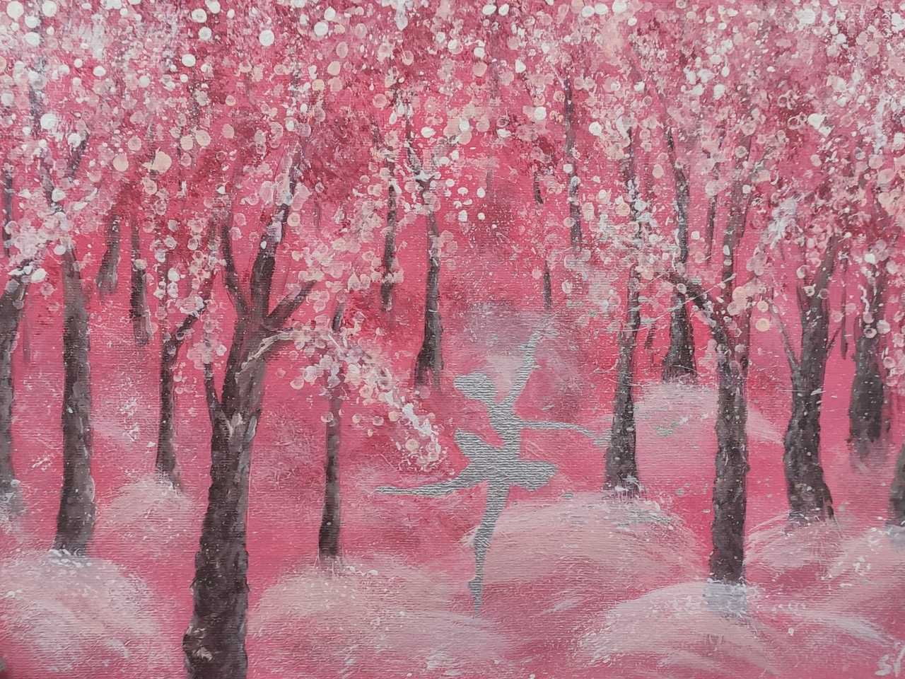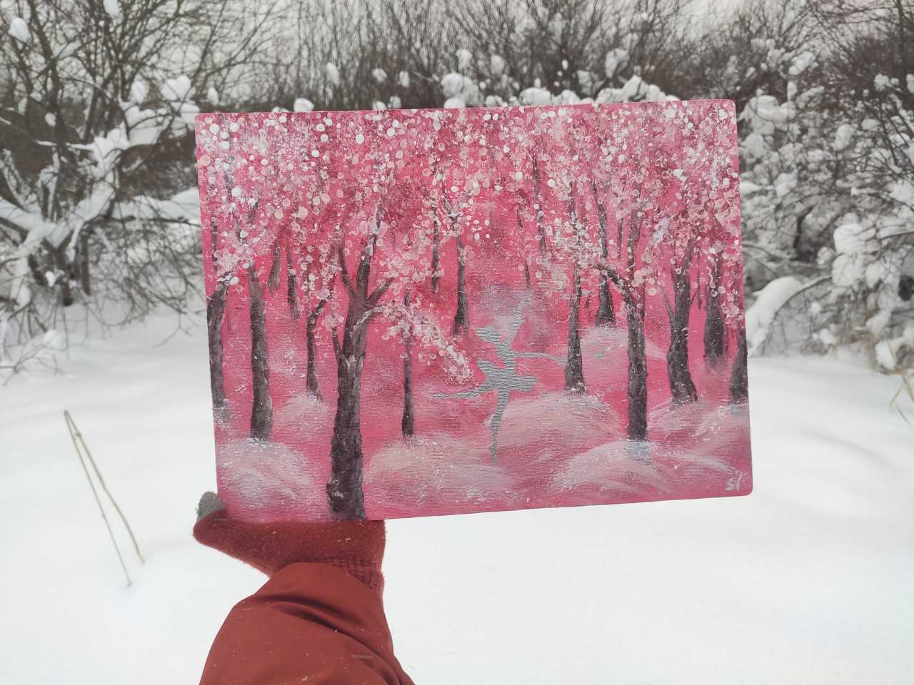 На эту картину меня вдохновили музыка Чайковского к балету «Щелкунчик» и волшебные декорации заснеженных деревьев. Фея-балерина осыпает лес сверкающими снежинками. Она написана серебряной краской, в снегу использованы блестки - под разным углом изображение переливается.