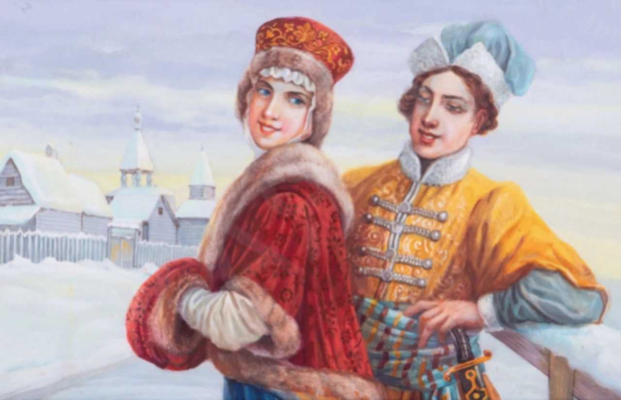 Aquarelle Cour dans les rues d`hiver de la Russie au 16ème siècle. Represente un jeune homme richement vêtu d`un caftan jaune s`occupant d`une jeune beaute ecarlate marchant le long d`une rue enneigee d`une ville en bois. Le bonheur insouciant de la jeunesse est peint sur leurs visages. dans les rues d`hiver de la Russie au 16ème siècle.