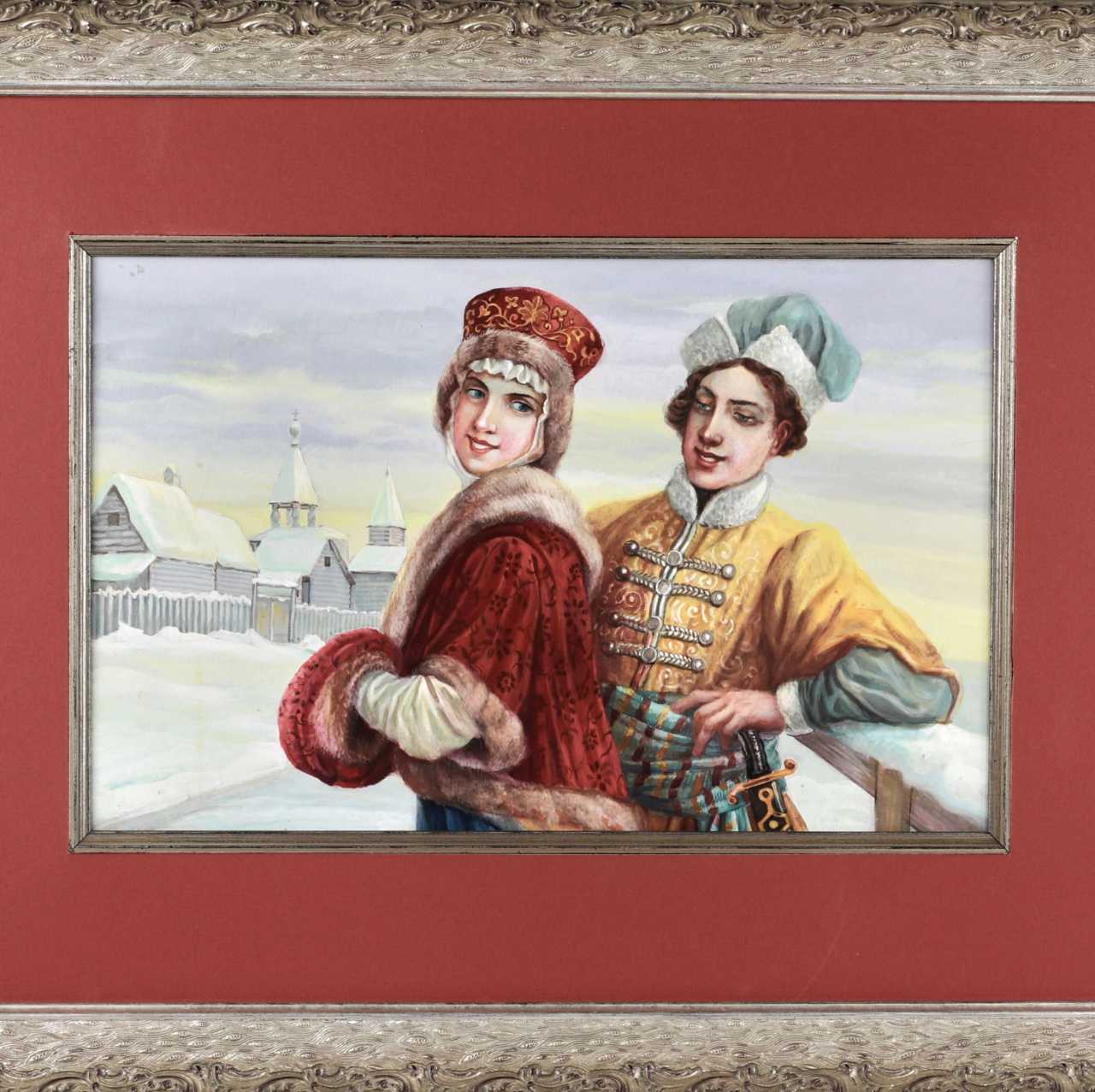 Aquarelle Cour dans les rues d`hiver de la Russie au 16ème siècle. Represente un jeune homme richement vêtu d`un caftan jaune s`occupant d`une jeune beaute ecarlate marchant le long d`une rue enneigee d`une ville en bois. Le bonheur insouciant de la jeunesse est peint sur leurs visages. dans les rues d`hiver de la Russie au 16ème siècle.