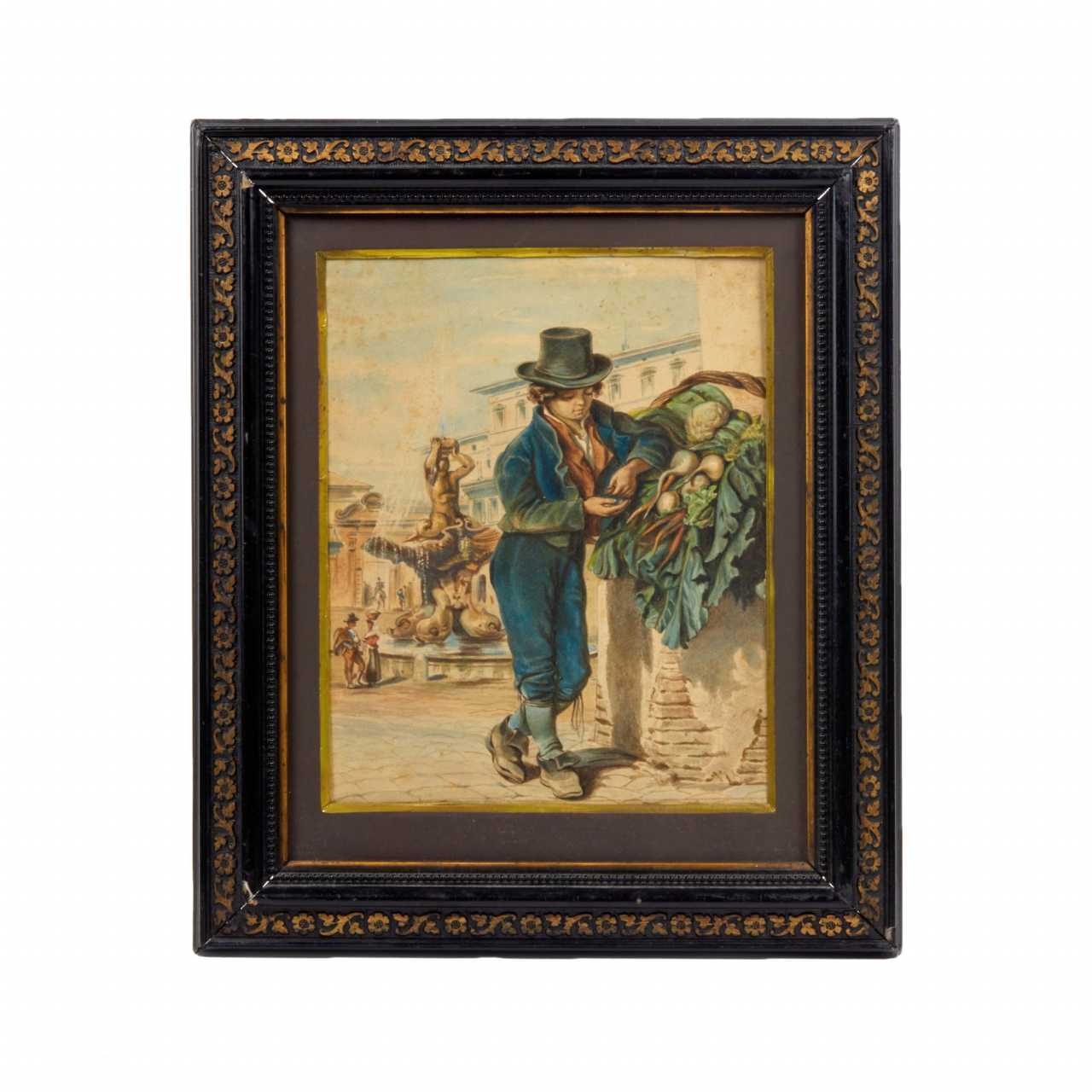 Aquarelle Une jeune vendeuse de legumes comptant des sous dans les rues de Rome. Au verso de la feuille se trouve une inscription : P.A. Rizzoni. 1822-1850. Taille de la feuille : 25x21 cm.