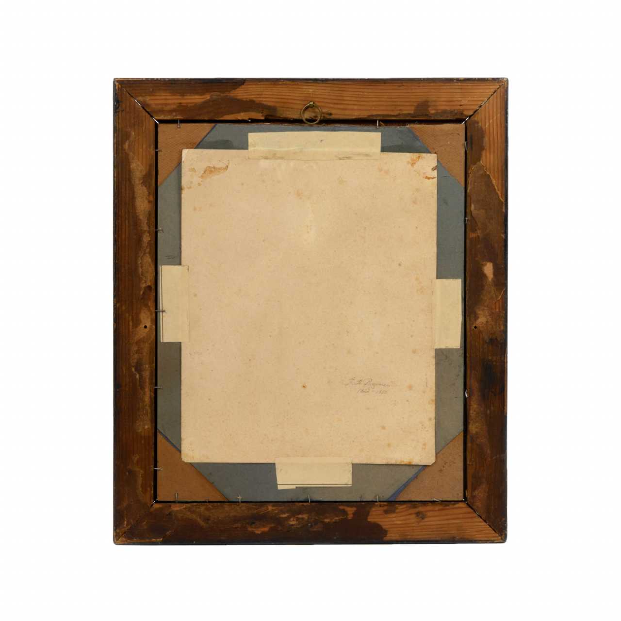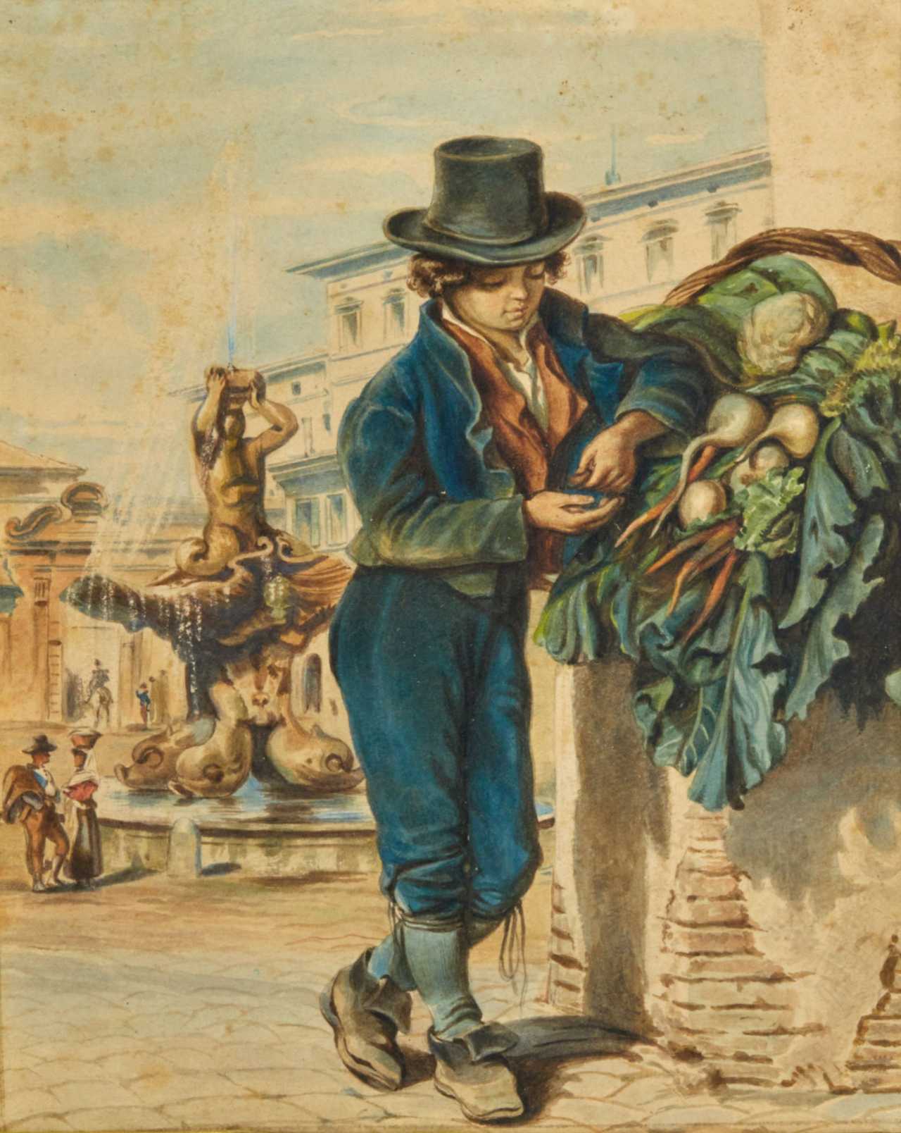 Aquarelle Une jeune vendeuse de legumes comptant des sous dans les rues de Rome. Au verso de la feuille se trouve une inscription : P.A. Rizzoni. 1822-1850. Taille de la feuille : 25x21 cm.