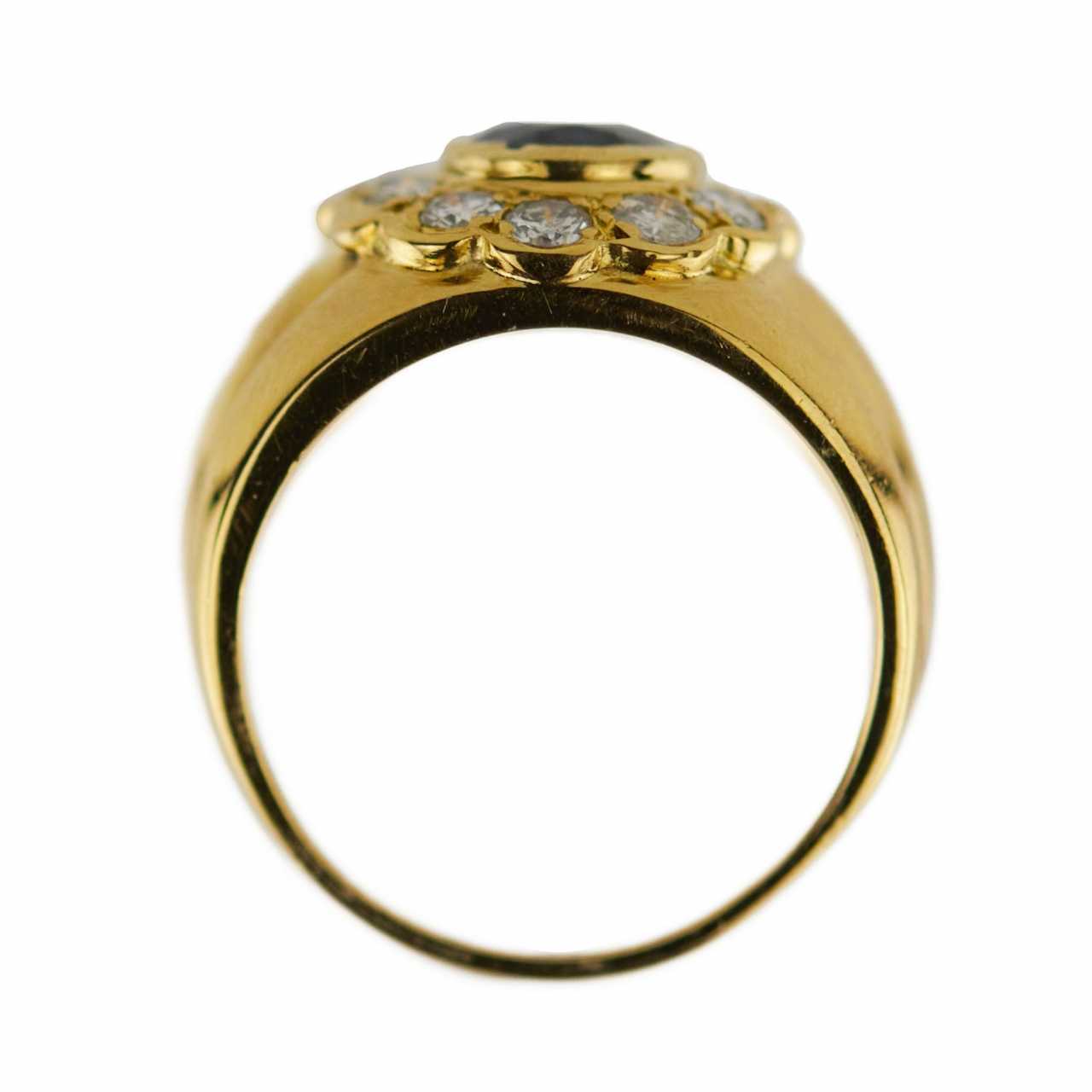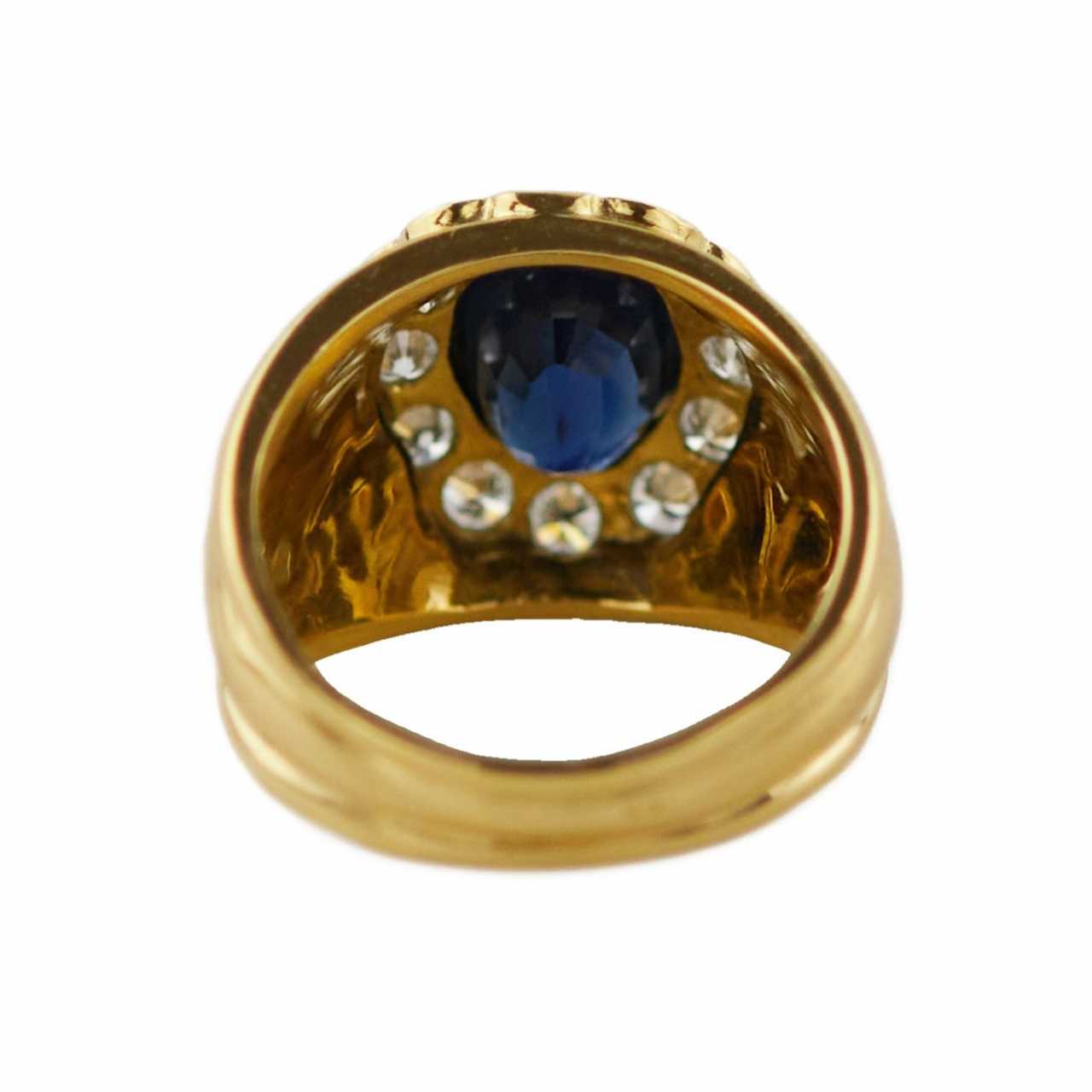 Bague-bague en or 18K avec un saphir pesant 3,0 carats de couleur bleu profond et 12 diamants pesant au total 0,9 carats G-HSi - i1. 750 pièces d`or. Saphir ovale parsemé de diamants. Poinçon italien d`or 750 dans un losange. Taille de bague : 11,94 Poids : 12 g.