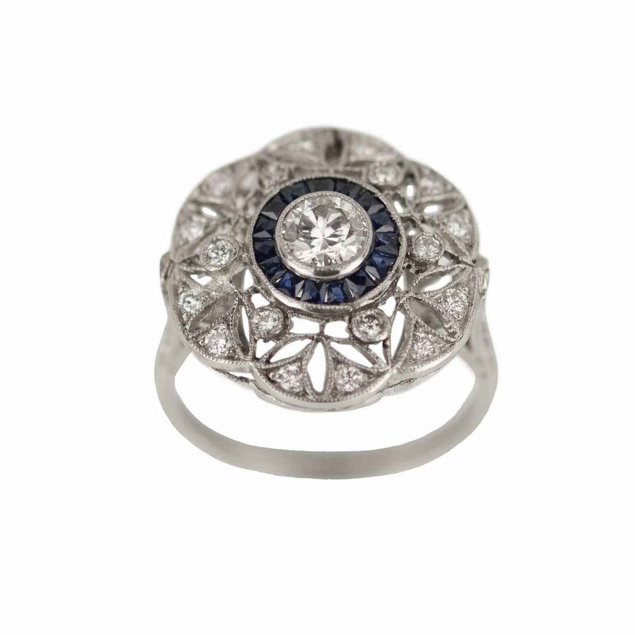 Bague de style Art Déco en platine 900 avec diamants et saphirs. Saphir 20th century