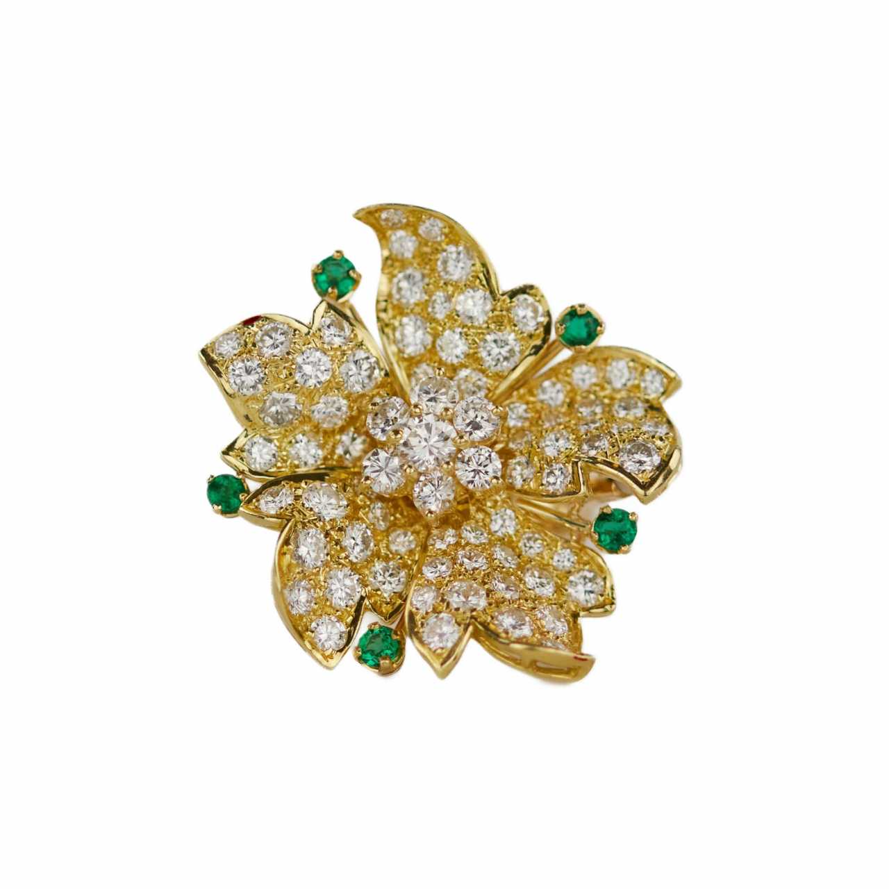 Bague en or 750 en forme de fleur diamantée avec diamants et émeraudes. 77 diamants ronds : 4,3 carats, VVS-VS. 5 émeraudes rondes, 0,36 carats. MI. Taille de bague : 16,5. Poids : 15,13 g. Certificat du Bureau danalyse letton 3-9-11892023.