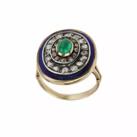 Bague en or 583 avec émeraude diamants et émail bleu. Émail Eclecticism 20th century