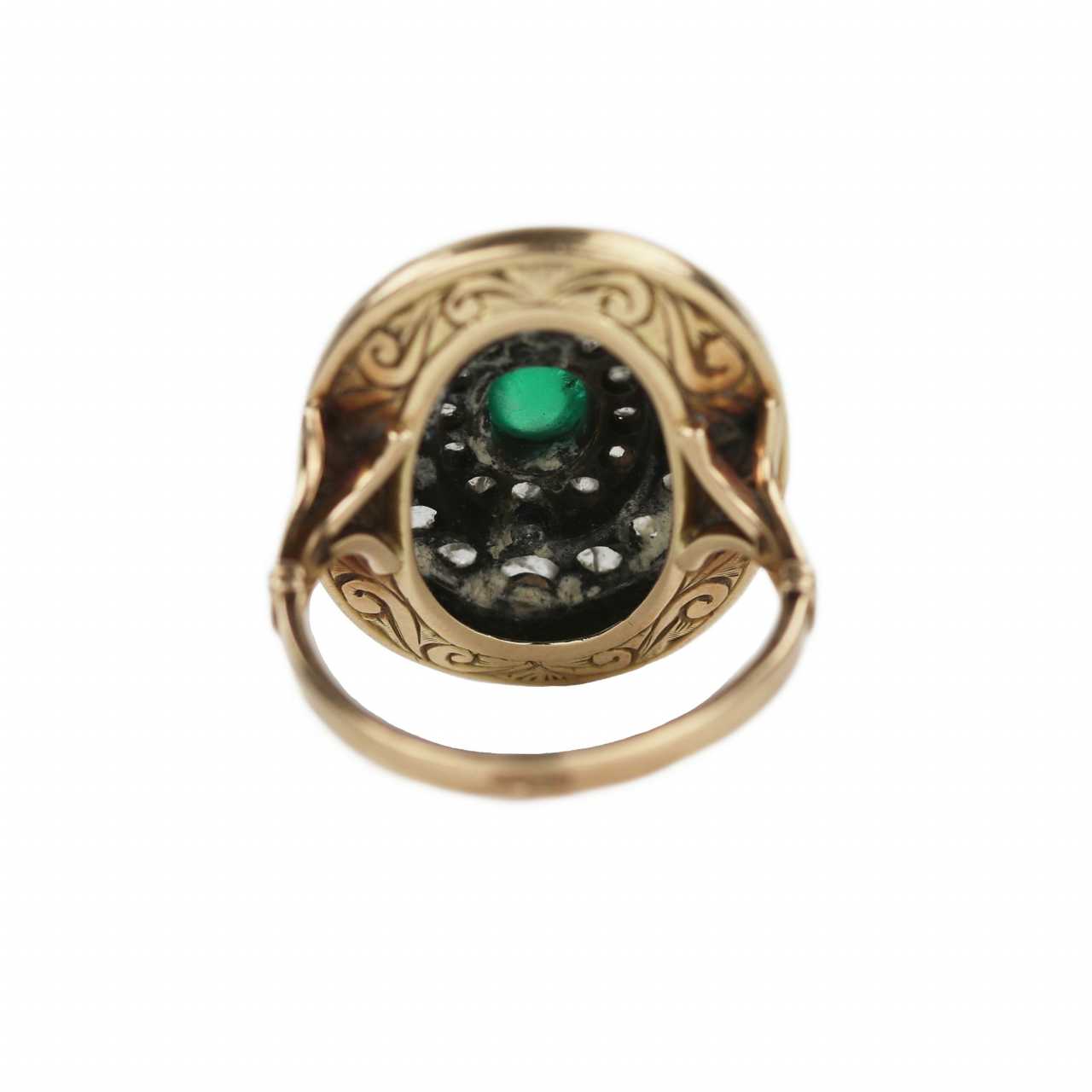 Bague en or 583 avec émail bleu, diamants taille ancienne et émeraude. De forme ovale et étagée, avec des ceintures démail, des diamants se rapprochant de lémeraude cabochon au centre de la composition. Poinçon soviétique de 583 échantillons dor de la ville dErevan, 1958-1990. Taille de bague : 17. Poids de la bague : 7 g.