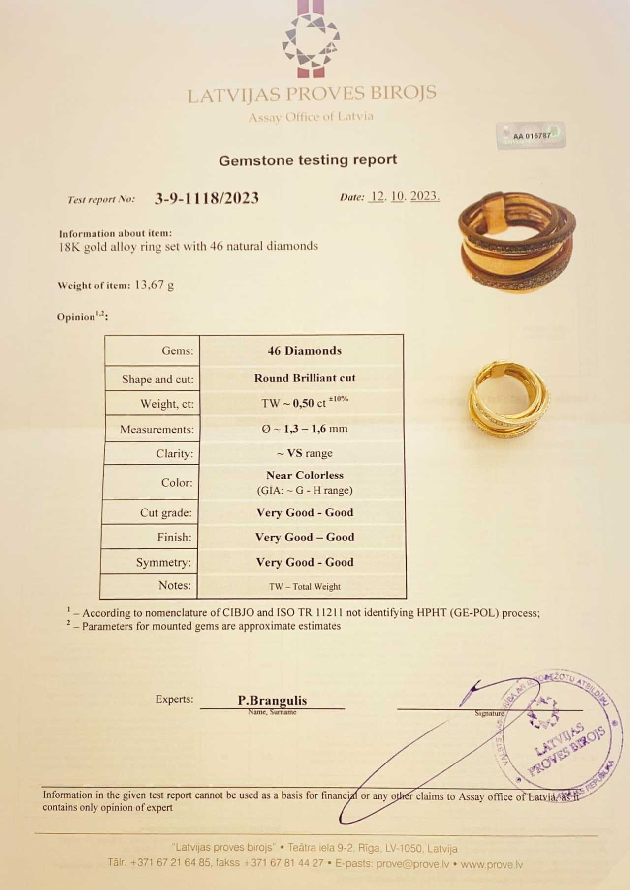 Bague en or 18 carats avec diamants. 46 diamants totalisant 0,50 carats, VS. Taille de bague : 17. Poids de la bague : 13,67 g. Certificat du Bureau danalyse letton : 3-9-11182023.