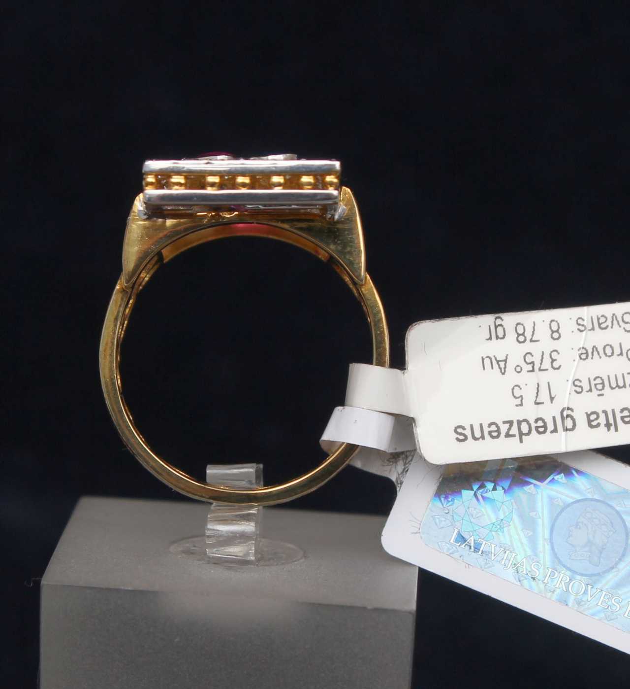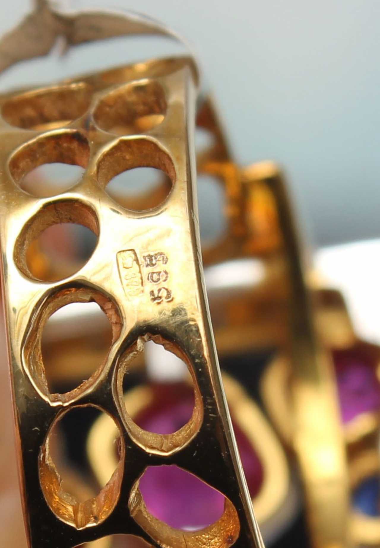 Or, proof 585, rubis 1,02+ 0,33+ 0,31 ct, saphirs 0,18 ct, diamants 0,6 ct. Diamètre intérieur 17 mm, poids 8,76 g