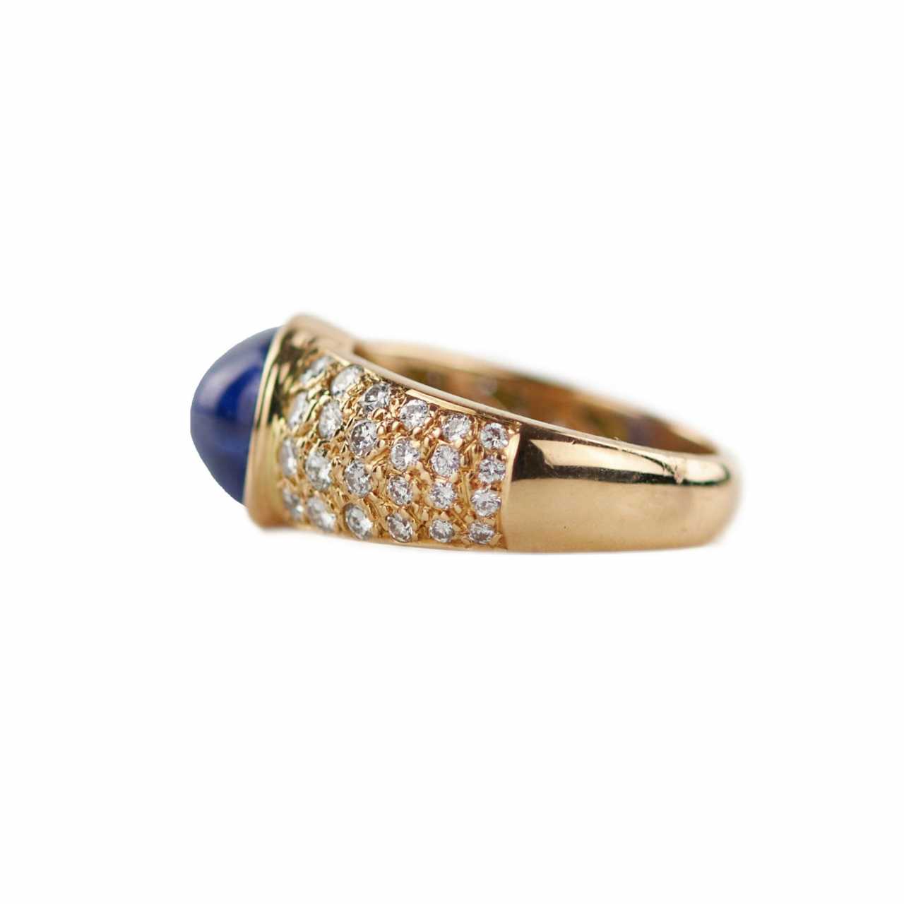 Bague en or 750 avec saphir cabochon et diamants. Saphir corindon : 5,5 carats. HI1. 48 diamants : 0,8 carat. VS-SI. Taille de bague 16,5. Poids : 7,71 g. Certificat du Bureau danalyse letton 3-9-8352023.