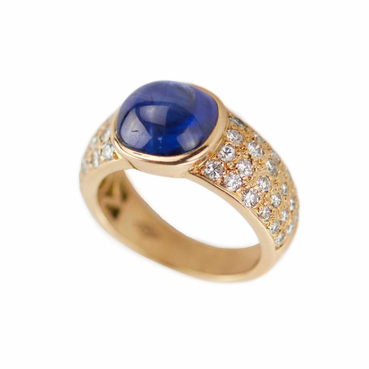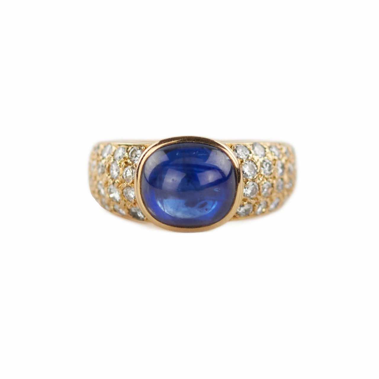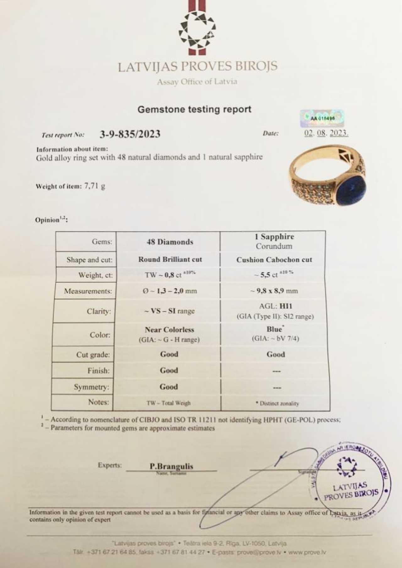 Bague en or 750 avec saphir cabochon et diamants. Saphir corindon : 5,5 carats. HI1. 48 diamants : 0,8 carat. VS-SI. Taille de bague 16,5. Poids : 7,71 g. Certificat du Bureau danalyse letton 3-9-8352023.