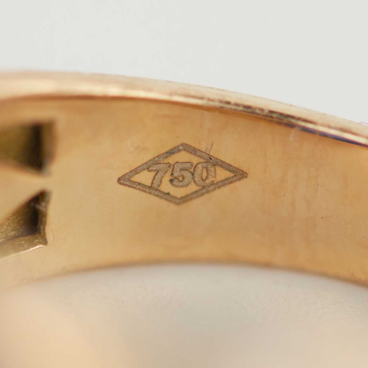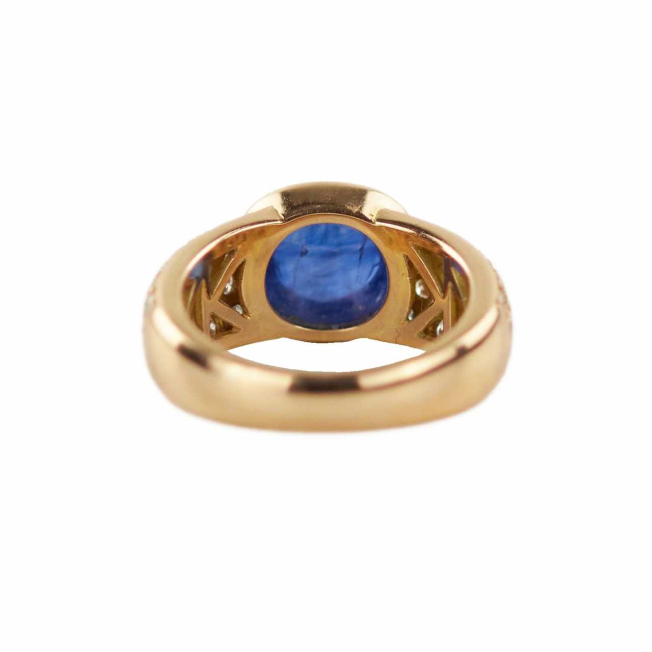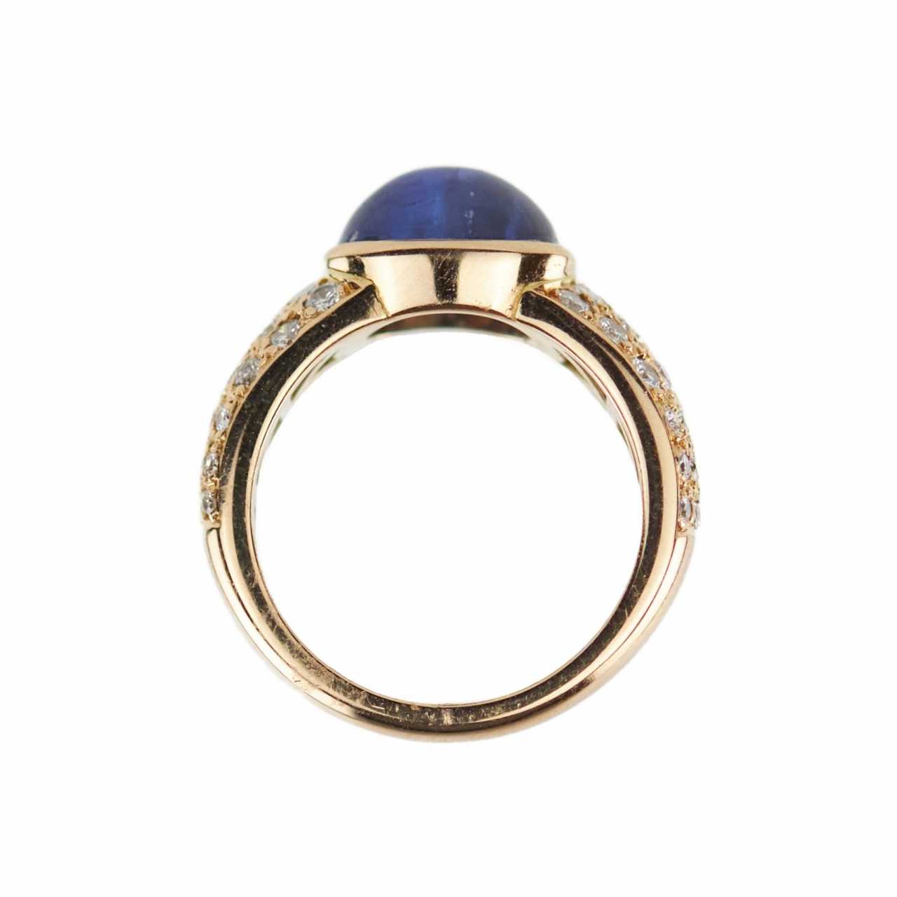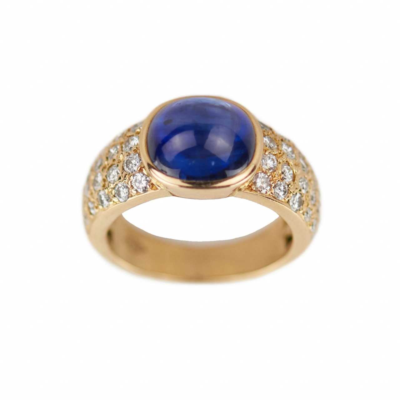 Bague en or 750 avec saphir cabochon et diamants. Saphir corindon : 5,5 carats. HI1. 48 diamants : 0,8 carat. VS-SI. Taille de bague 16,5. Poids : 7,71 g. Certificat du Bureau danalyse letton 3-9-8352023.