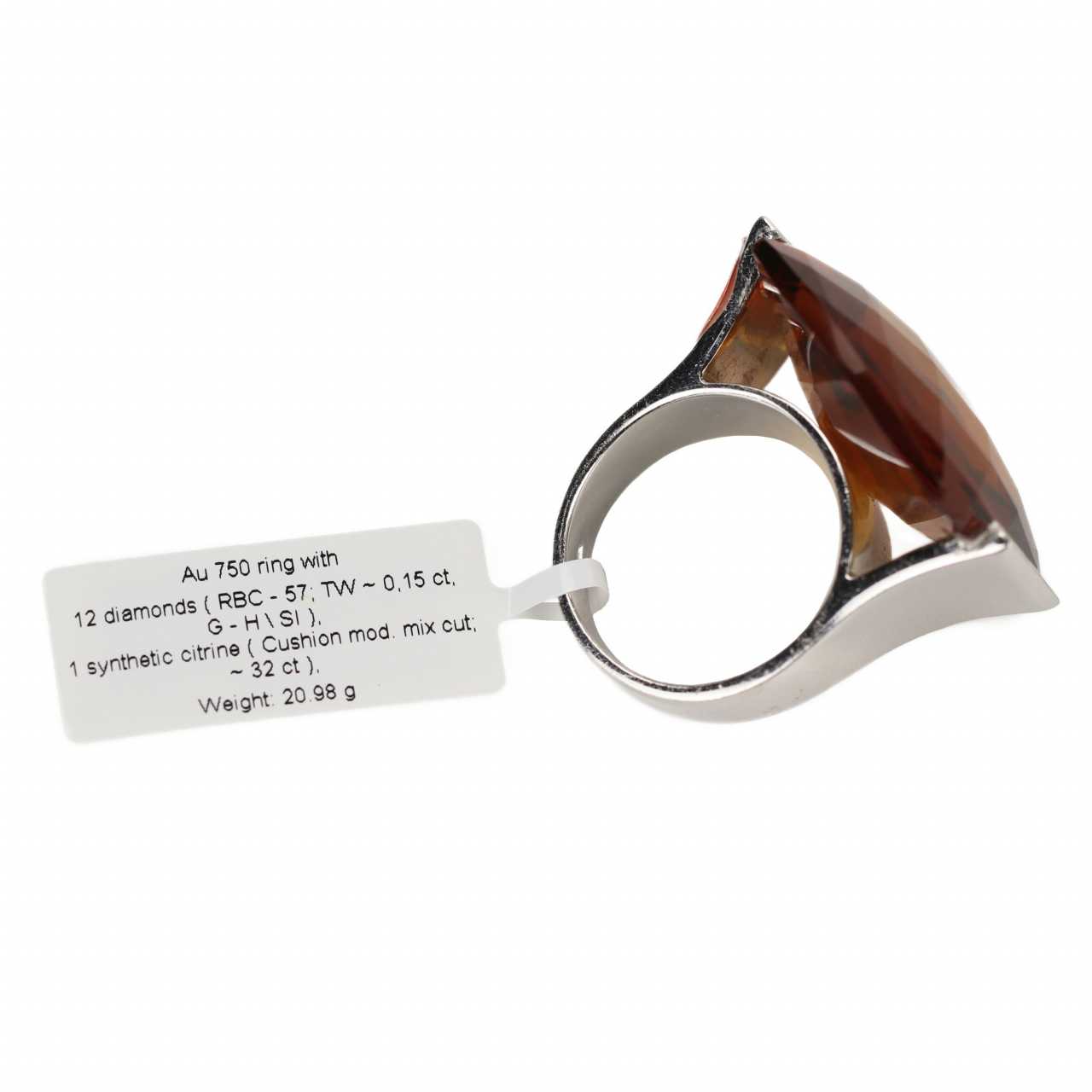 Bague en or blanc 18 carats avec un Cetrin central synthétique couleur cognac et 12 diamants totalisant 0,15 carats. Italie. Deuxième moitié du 20ème siècle. Poids : 20,98 g. Taille de bague : 18.