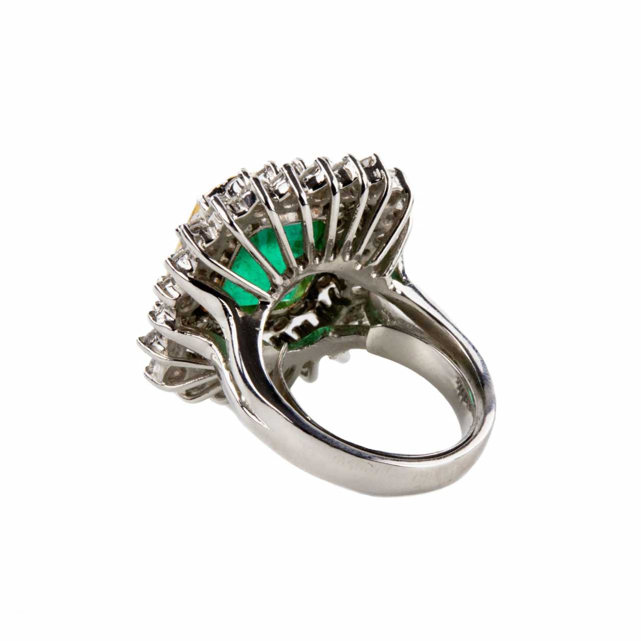 Magnifique bague cocktail en platine, ornee au centre d`une emeraude naturelle pesant 6,81 carats et de diamants pesant 2,75 carats.Poids du produit : 19,58 g.
