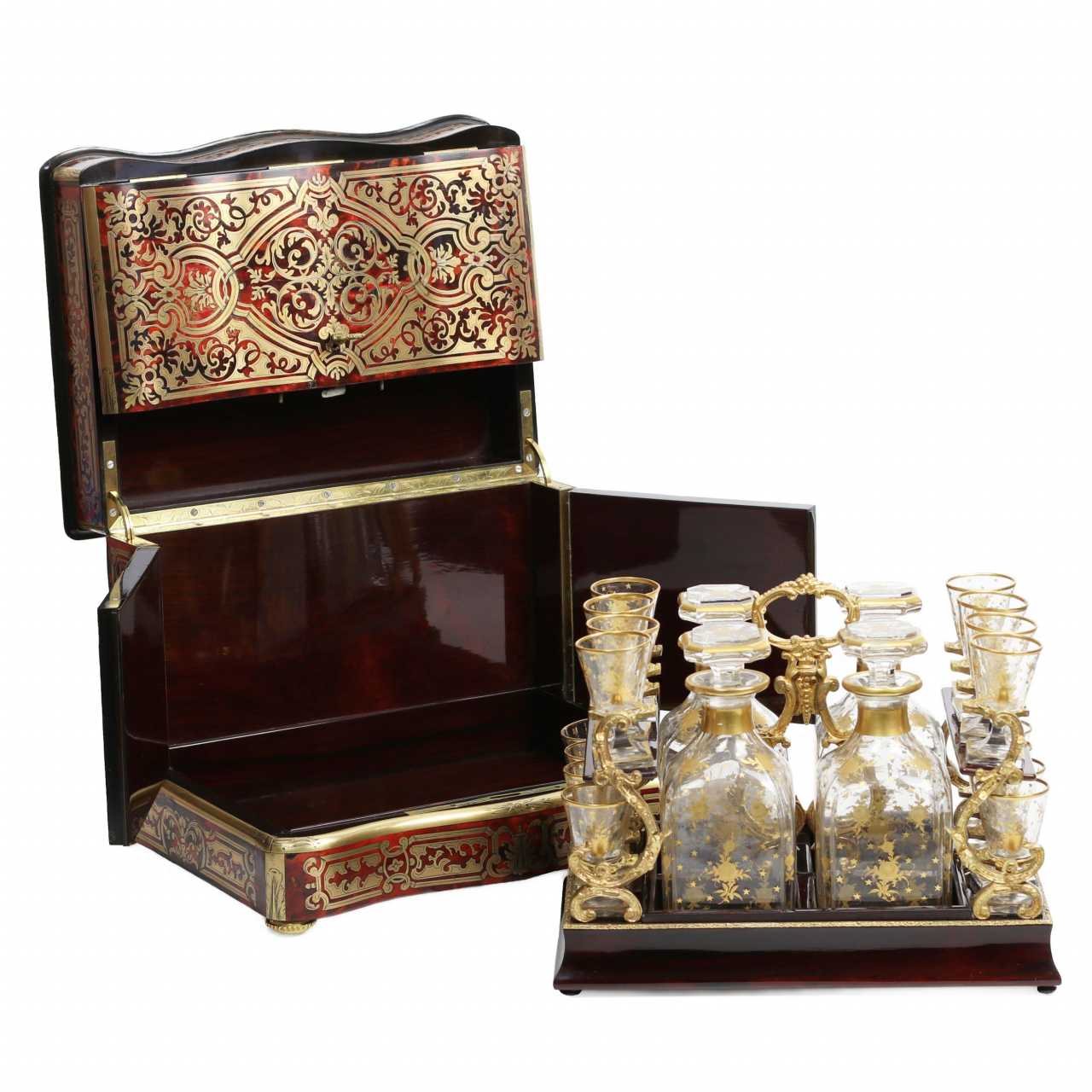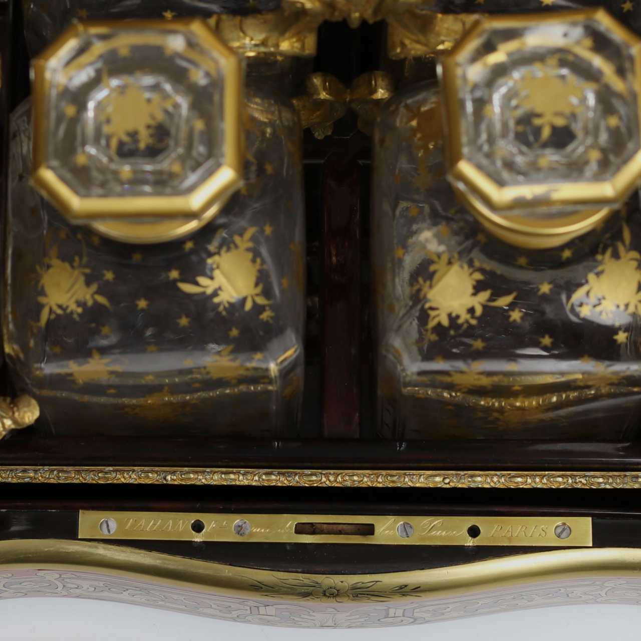 Cette magnifique Cave à liqueur, réalisée dans le troisième quart du 19ème siècle par TAHAN, est un exemple d`un savoir-faire et d`une élégance hors du commun. Doté d`incrustations en laiton de style Boulle et en écaille de tortue, son design unique en fait une pièce de bureau pour hommes remarquable, conçue pour les conversations tranquilles et le plaisir de boissons raffinées. Le bar est doté d`un insert plaqué or amovible pouvant contenir quatre bouteilles de spiritueux, ornées d`or. motifs plaqués fleurs et étoiles. L`ensemble comprend également seize verres taillés, décorés dans le même style. Signature sur la serrure : « Tahan Ft Rue de la Paix » Dimensions fermé : hauteur 26 cm, largeur 34 cm, profondeur 26 cm Une restauration professionnelle complète a été réalisée.