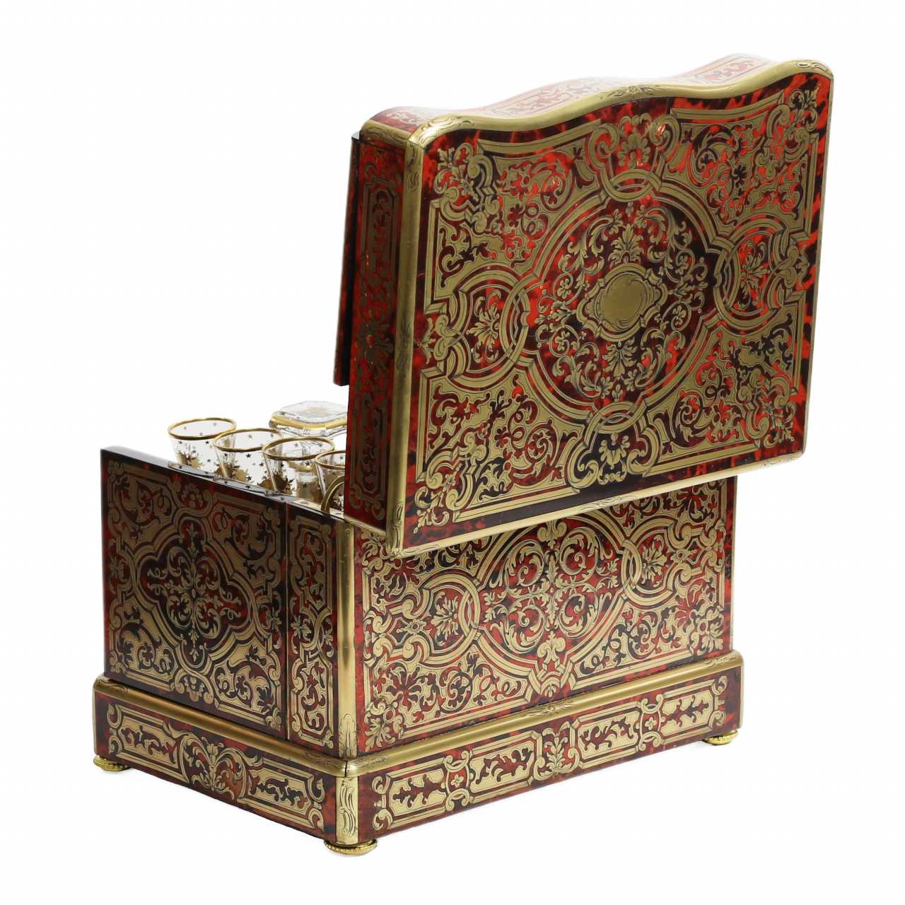 Cette magnifique Cave à liqueur, réalisée dans le troisième quart du 19ème siècle par TAHAN, est un exemple d`un savoir-faire et d`une élégance hors du commun. Doté d`incrustations en laiton de style Boulle et en écaille de tortue, son design unique en fait une pièce de bureau pour hommes remarquable, conçue pour les conversations tranquilles et le plaisir de boissons raffinées. Le bar est doté d`un insert plaqué or amovible pouvant contenir quatre bouteilles de spiritueux, ornées d`or. motifs plaqués fleurs et étoiles. L`ensemble comprend également seize verres taillés, décorés dans le même style. Signature sur la serrure : « Tahan Ft Rue de la Paix » Dimensions fermé : hauteur 26 cm, largeur 34 cm, profondeur 26 cm Une restauration professionnelle complète a été réalisée.
