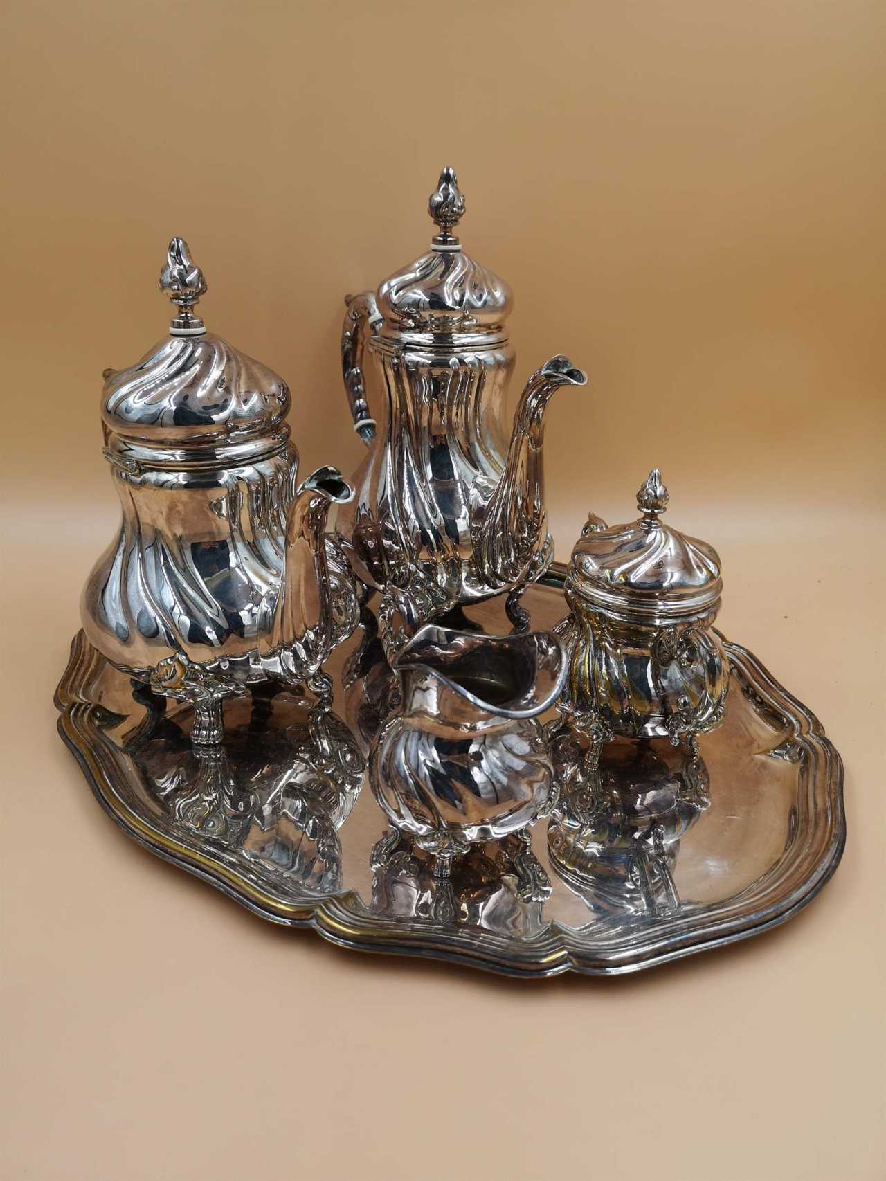 Beautiful tea - coffee service.Silver plated.Italy.1930s.Height 27cm; tray size 46x36cm
