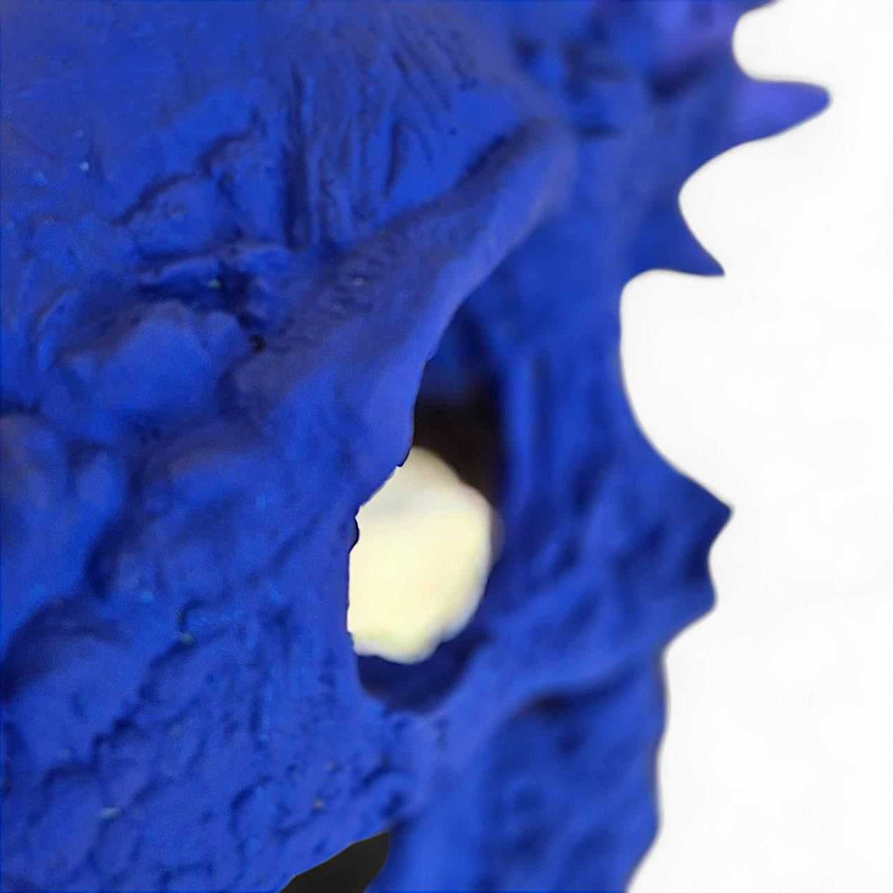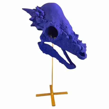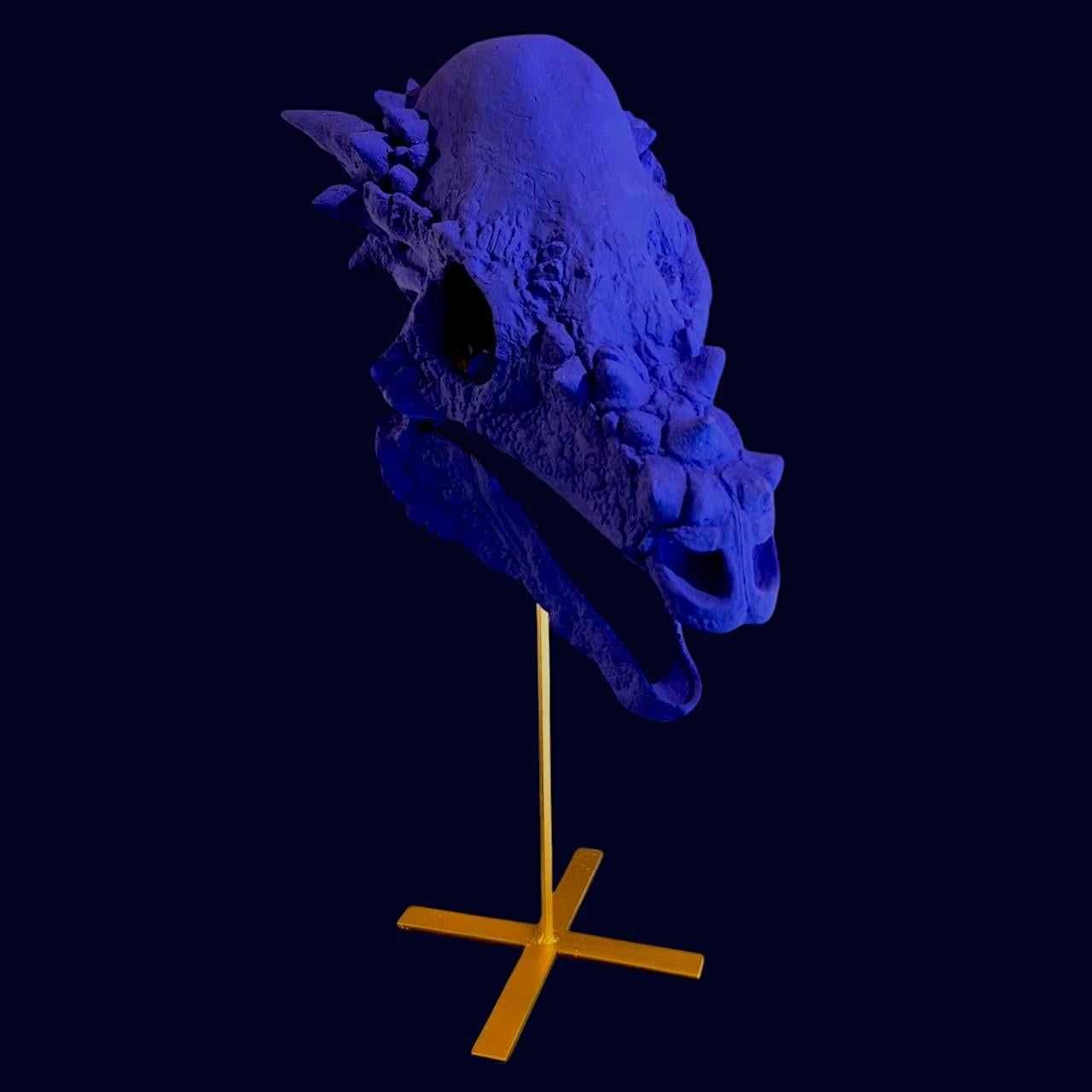 Hailing from the wild coastal edges of Australia, multidisciplinary artist Wesley Smith works at the confluence of paleontology, myth, and radical contemporary aesthetics. Blue Reverie 3 exemplifies his ability to blur the boundaries between artifact and icon, science and ritual.At the heart of this singular sculpture lies a meticulously reproduced Pachycephalosaurus skull — a creature from the Late Cretaceous period, symbol of endurance and enigma. Smith submerges the form entirely in Klein blue pigment, that luminous ultramarine synonymous with spiritual intensity and aesthetic absolutes.The result is more than a visual intervention — it is an act of transformation. The skull becomes a totemic object, at once prehistoric and futuristic. Radiating both pop sensibility and post-anthropocenic urgency, Blue Reverie 3 invites reflection on extinction, memory, and the human need to mythologize.Blue Reverie 3 is a sculptural manifesto, a relic of imagined cosmologies, and a mesmerizing focal point for collectors of the bold, the conceptual, and the iconoclastic.