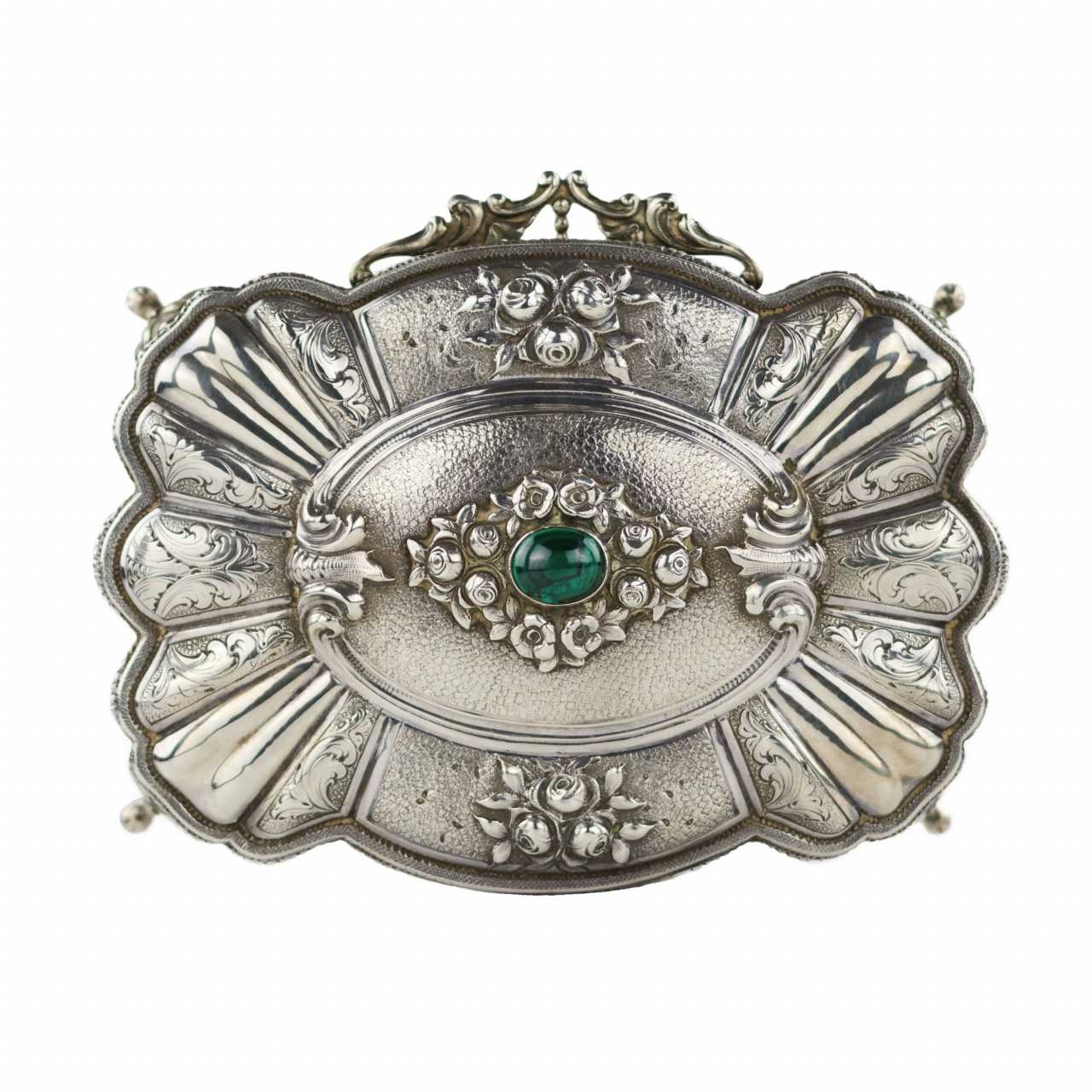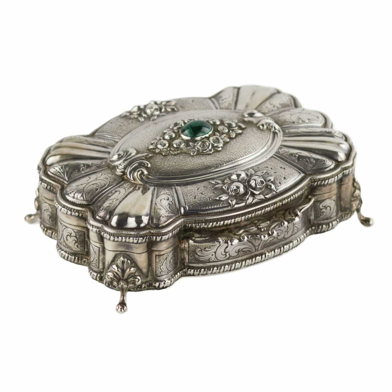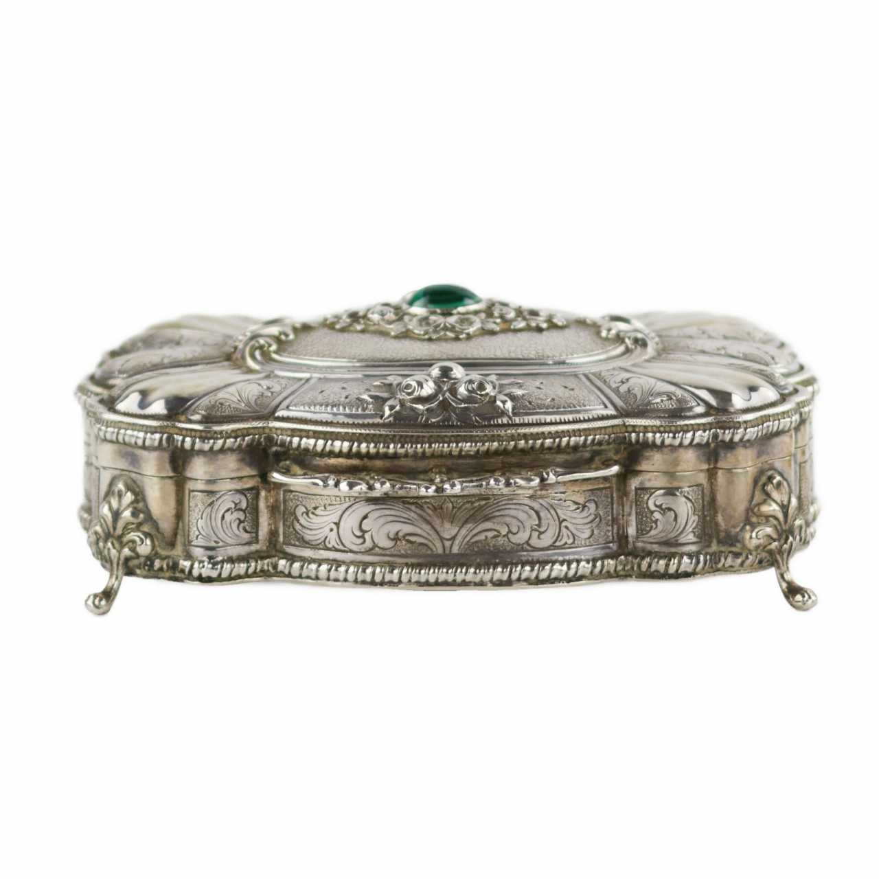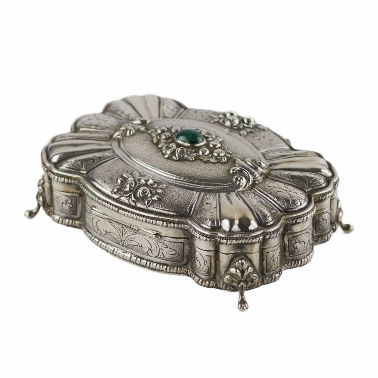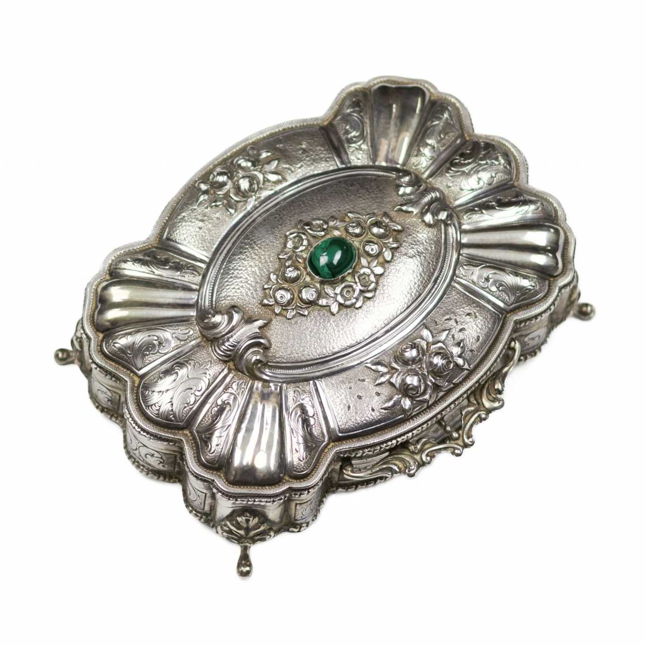 Grande boîte en argent, standard 800, du tournant des 19e-20e siècles. Fabriqué et richement décoré dans un style baroque. Plastique complexe et volumineux, monté sur quatre pieds. Lensemble de bijoux utilise des motifs de coquillages, de vagues et de fleurs. Lintérieur est doublé de velours. Le couvercle est couronné dun cabochon vert. Dimensions : 19X15X5 cm Poids : 300 g.