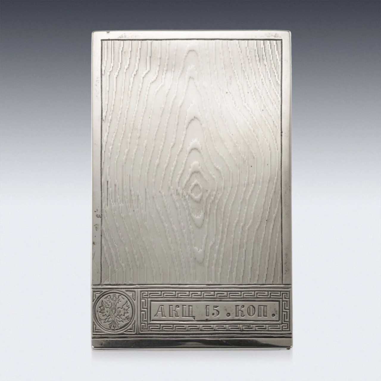 Boîte à cigares russe en argent du debut du XXème siècle de style imperial. Le couvercle rectangulaire à charnière, les côtes et la base sont graves dimitations de bois et de taxes daccise sur le tabac.Les deux parties sont marquees dargent russe 84 (norme 875), Moscou, 1899-1908, poinçon F.O. (Fyodor Ovchinnikov). TAILLE : Hauteur : 3 cm, Largeur : 14 x 9 cm, Poids : 314 g