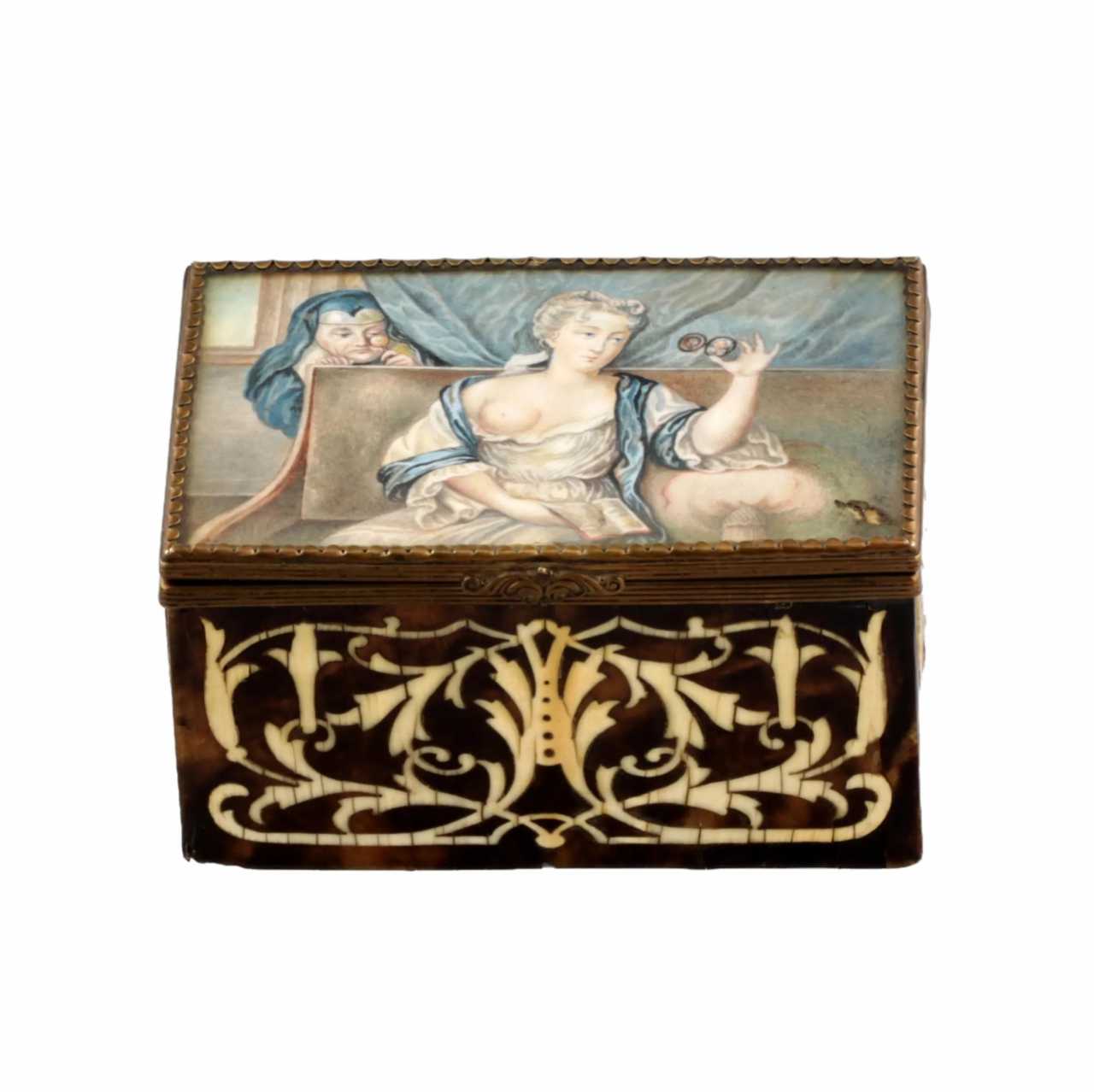 Boîte avec une scène erotique en tortue et ivoire. Une fille à la poitrine nue languit pour son amant avec un livre, sous la surveillance d`une religieuse à la loupe. Aquarelle sur l`os. Signature: Baumana? 19e siècle L. 12 cm. Hauteur 6,5 cm. B. 8 cm.