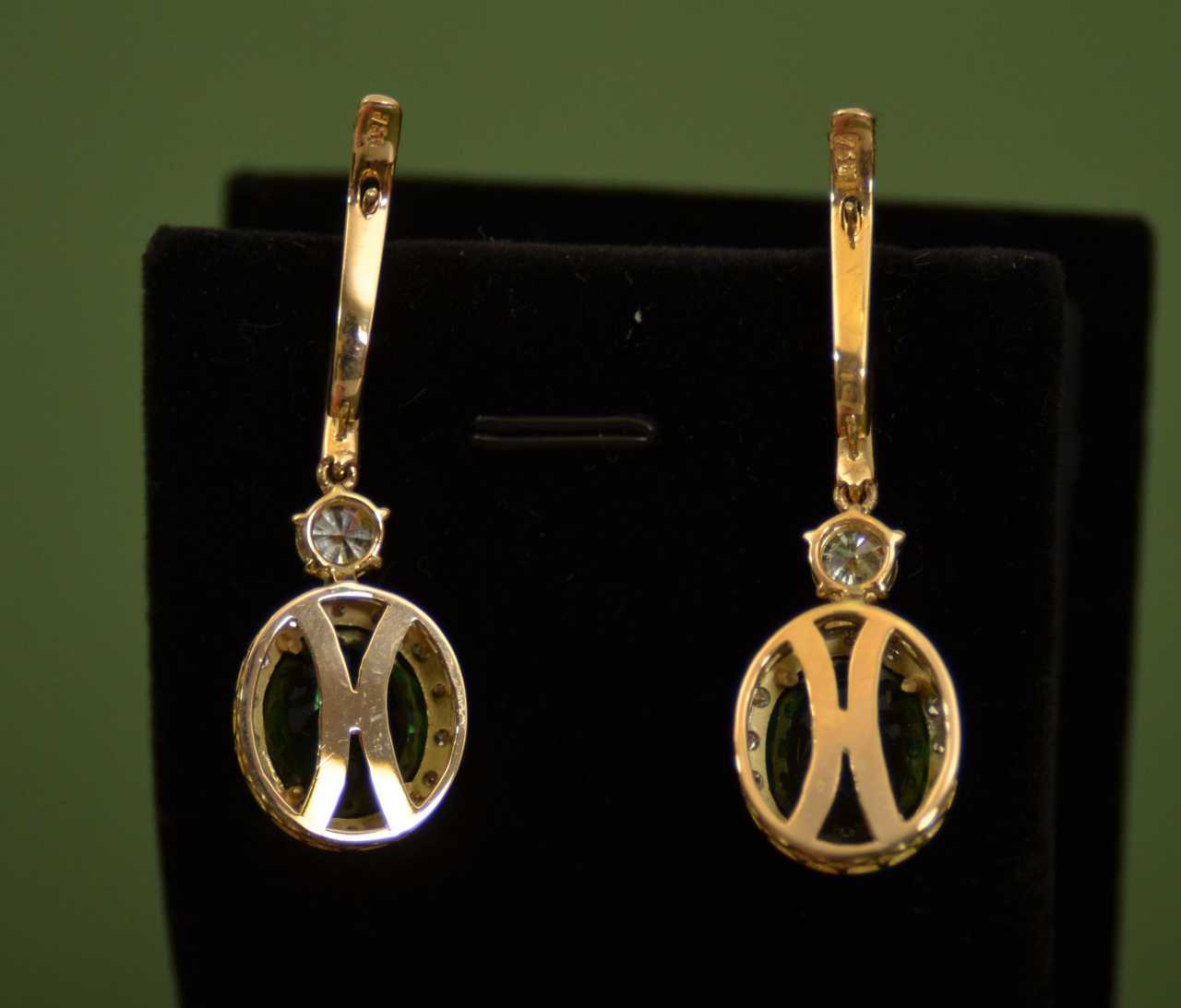 Or, proof 750, 18K, diamant 2 pcs.- 1,4 ct, 5,6-5,7 cm, SI, marron clair ; 48 diamants - 0,70 ct, 1,1-1,6 mm, VVS-VS ; 2 tourmalines - taille mixte ovale, 11 ct, 10,1-12,1 mm, MI1, verte. Poids 12,09 g. Avec certificat