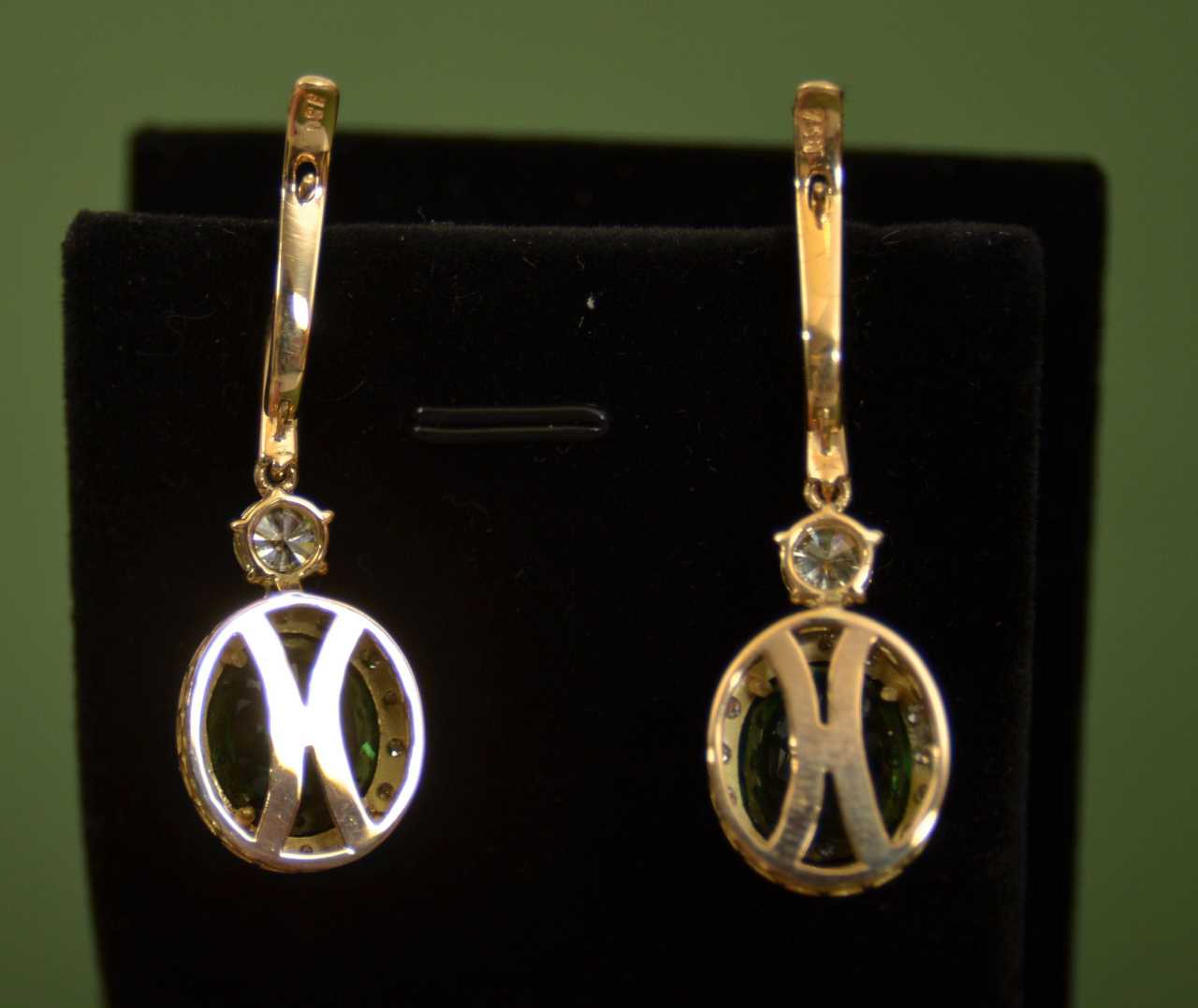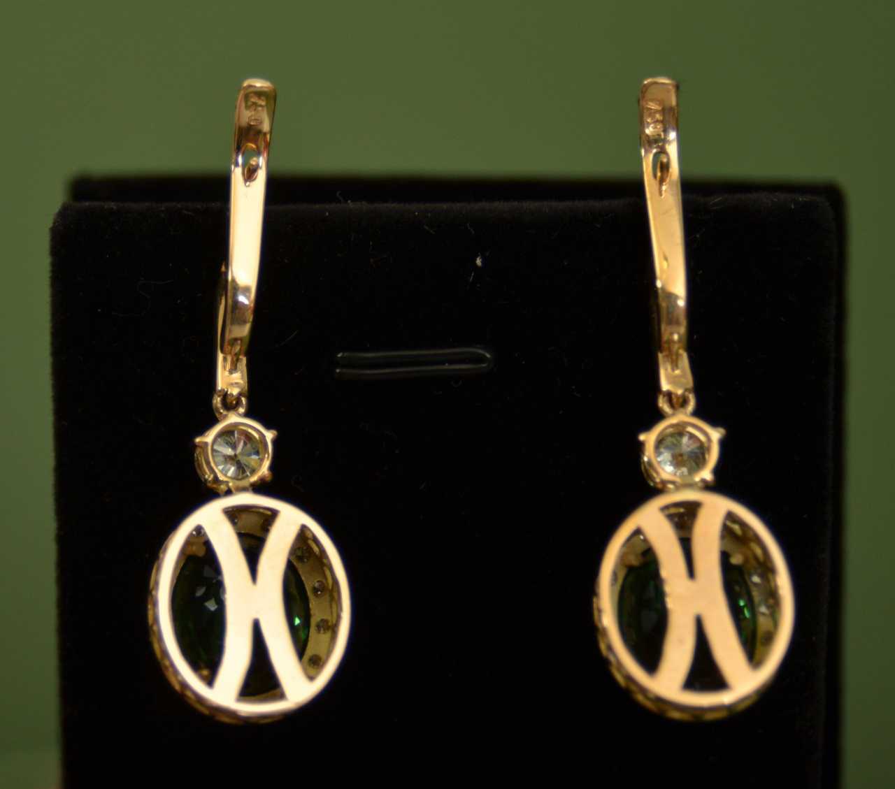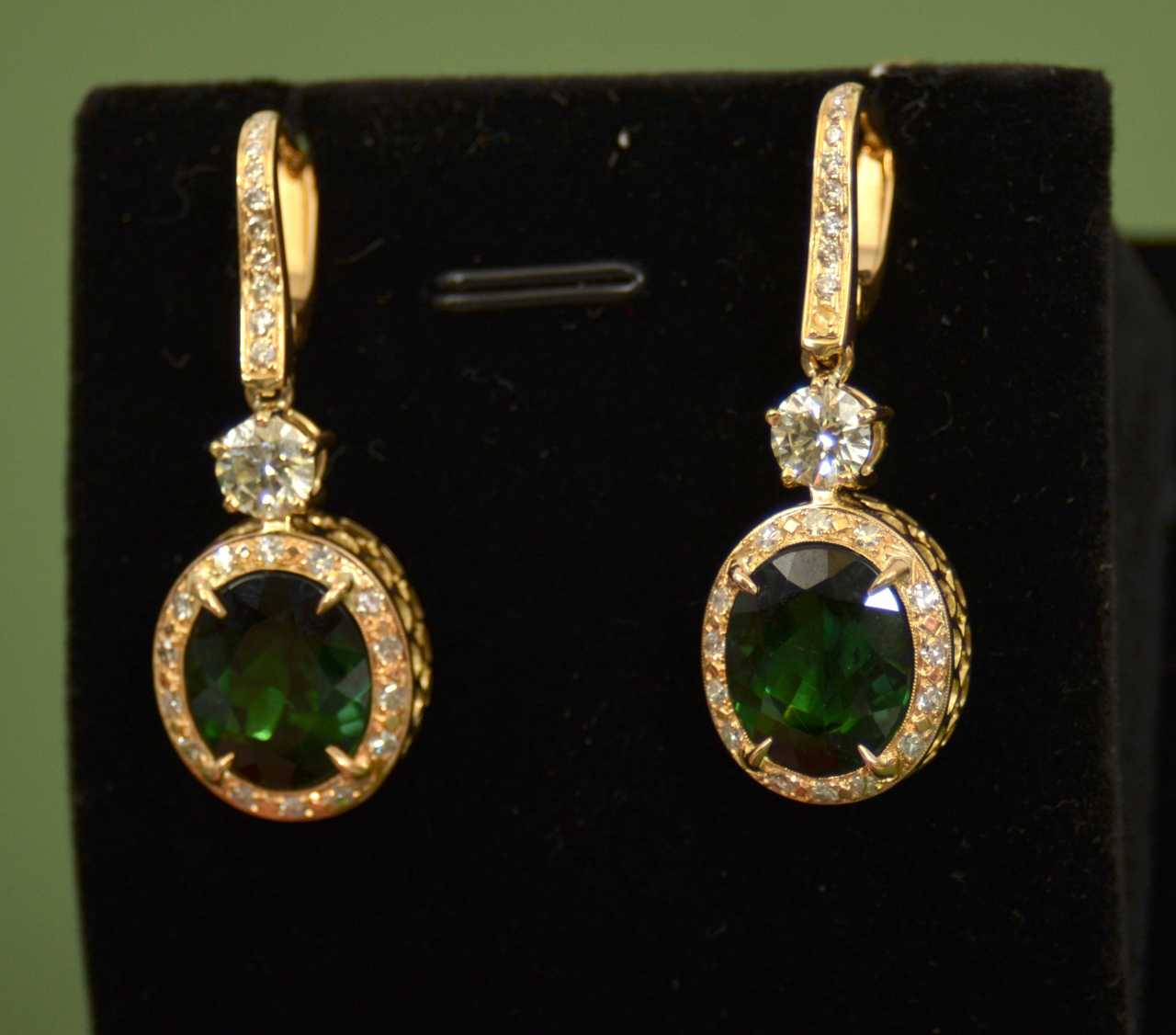 Or, proof 750, 18K, diamant 2 pcs.- 1,4 ct, 5,6-5,7 cm, SI, marron clair ; 48 diamants - 0,70 ct, 1,1-1,6 mm, VVS-VS ; 2 tourmalines - taille mixte ovale, 11 ct, 10,1-12,1 mm, MI1, verte. Poids 12,09 g. Avec certificat