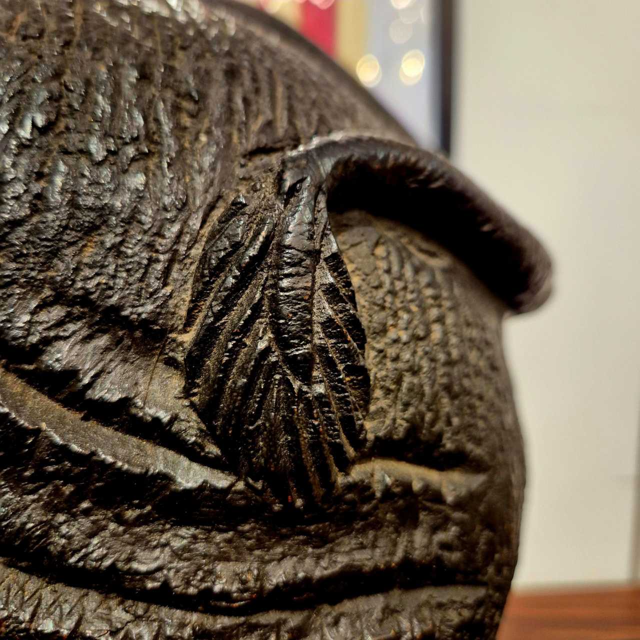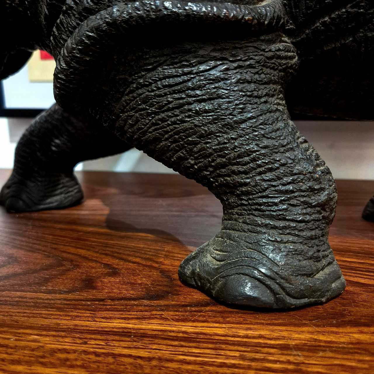 Superbe rhinocéros en bois massif sculpté : le travail de sculpture est en effet admirable par sa finesse et l’attention portée aux détails ; il présente également une magnifique patine brillante et douce à certains endroits.Une pièce de caractère étonnante et originale qui convient pour un intérieur classique comme contemporain.