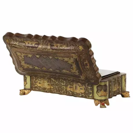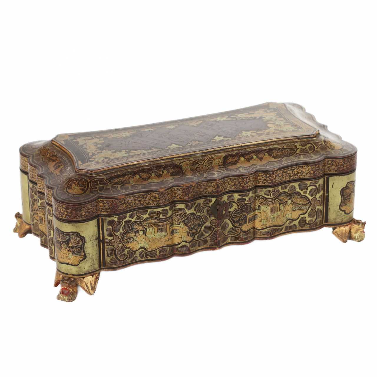 Une caisse en bois de forme octogonale montée sur 4 pieds avec un contraste spectaculaire de laque noire et dorée dans le décor est destinée aux jeux de société. Le corps de la boîte est décoré de scènes de palais exquises qui reflètent la richesse et la sophistication de la culture chinoise de cette époque. L`intérieur de la boîte est divisé en trois compartiments contenant chacun huit petites tasses et jetons en nacre. Chine. 19ème siècle. Canton. Dimensions : 11,5 x 33 x 17,5 cm.