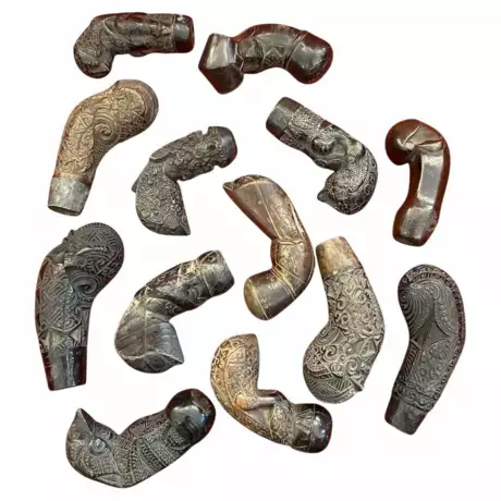 A set of thirteen kriss handles originating from Java, Indonesia, dating from the late 18th to early 19th century.Beautiful aged patina in dark or amber tones. Exquisite carving work featuring zoomorphic motifs, floral designs, and deities.Height ranges from 8 to 12 cm – Width: 4 to 5 cmThe kriss is a traditional weapon, consisting of a long dagger or a slender sword with a blade that can be straight or wavy, sharpened on both edges. The earliest known krisses date back to the 14th century and are believed to have originated in Java. However, much older depictions can be seen in the bas-reliefs of the Borobudur and Prambanan temples, built in the 9th century in central Java.The kriss gained popularity in the 16th century, alongside the rise of maritime trade across Southeast Asia. Interestingly, until 1910, two krisses were featured on the national flag of the Kingdom of Thailand.Believed to possess magical powers, the kriss also serves a ritual purpose. Each one is crafted for a single owner, who is spiritually involved in the process with the blacksmith. So important is the kriss that it can symbolically stand in for its owner during ceremonies.In the 19th and 20th centuries, the kriss became especially popular due to its use in traditional Balinese dance performances. Since 2008, the kriss and the art of its craftsmanship have been inscribed on UNESCO’s list of Intangible Cultural Heritage of Humanity.