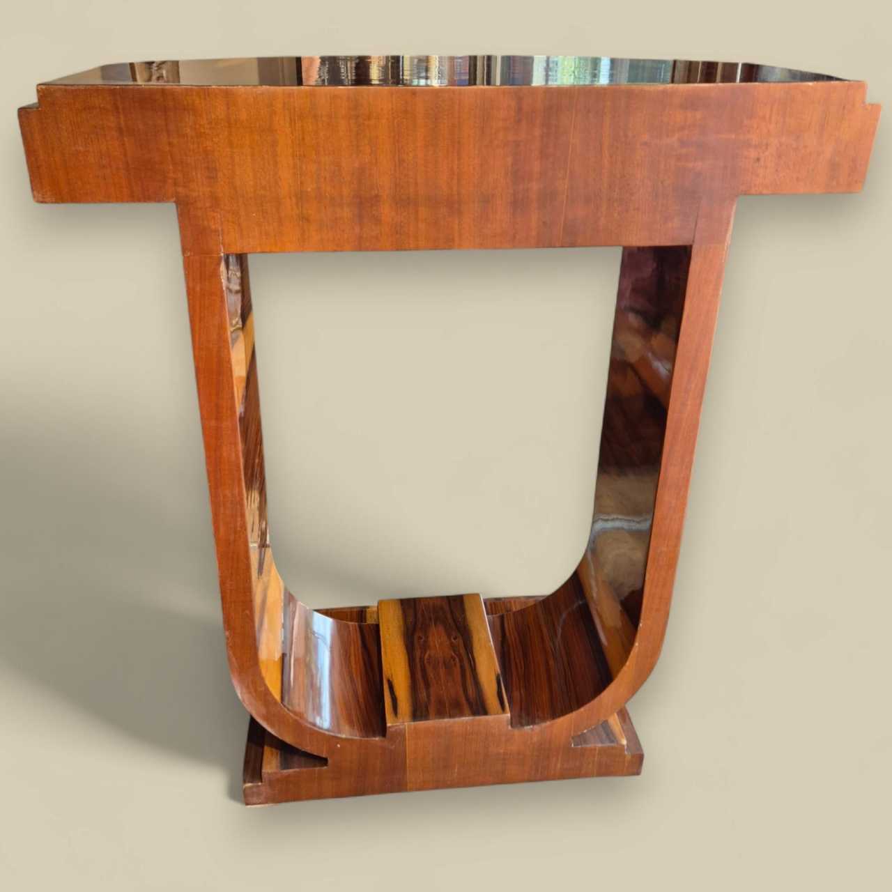 Console de style Art Déco, réalisée en placage de bois exotique, probablement du palissandre ou du palissandre, soigneusement sélectionné pour son veinage spectaculaire et son contraste naturel. Cette pièce présente une structure architecturale typique du mouvement Art Déco, avec des lignes géométriques audacieuses et une élégante symétrie. Son piètement en U inversé repose sur un socle à plusieurs niveaux, conférant à l&39;ensemble une allure sculpturale et équilibrée. Le plateau en demi-lune est souligné par un bord discret et raffiné, parfaitement intégré au design général. La finition brillante sublime la richesse du bois et témoigne d&39;un savoir-faire méticuleux, probablement réalisé au vernis au tampon, comme c&39;était courant à l&39;époque. Cette pièce incarne l&39;esprit du luxe discret et met en valeur le savoir-faire raffiné des années 1930. Idéale dans une entrée, un salon ou un couloir, elle apportera une touche d&39;élégance intemporelle à tout intérieur classique ou contemporain.
