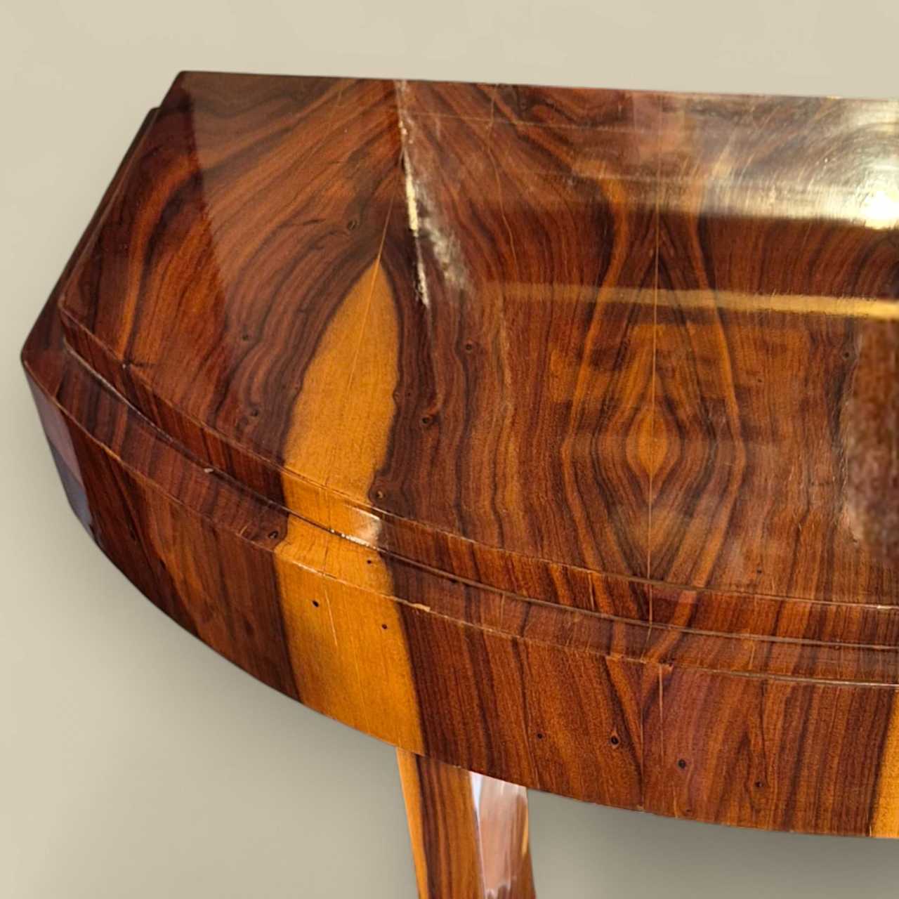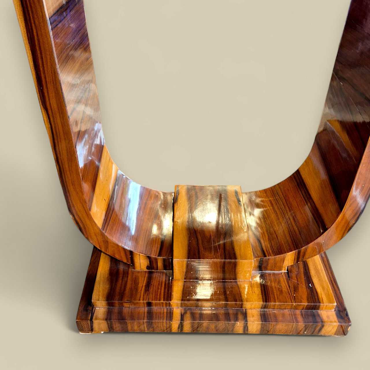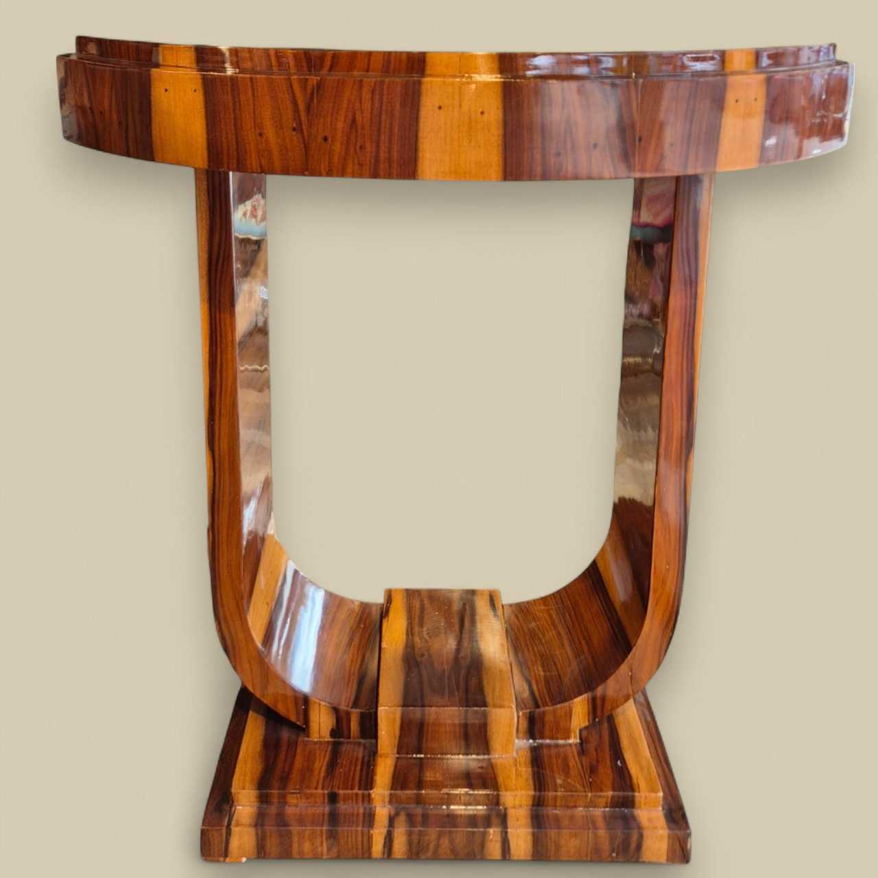 Console de style Art Déco, réalisée en placage de bois exotique, probablement du palissandre ou du palissandre, soigneusement sélectionné pour son veinage spectaculaire et son contraste naturel. Cette pièce présente une structure architecturale typique du mouvement Art Déco, avec des lignes géométriques audacieuses et une élégante symétrie. Son piètement en U inversé repose sur un socle à plusieurs niveaux, conférant à l&39;ensemble une allure sculpturale et équilibrée. Le plateau en demi-lune est souligné par un bord discret et raffiné, parfaitement intégré au design général. La finition brillante sublime la richesse du bois et témoigne d&39;un savoir-faire méticuleux, probablement réalisé au vernis au tampon, comme c&39;était courant à l&39;époque. Cette pièce incarne l&39;esprit du luxe discret et met en valeur le savoir-faire raffiné des années 1930. Idéale dans une entrée, un salon ou un couloir, elle apportera une touche d&39;élégance intemporelle à tout intérieur classique ou contemporain.