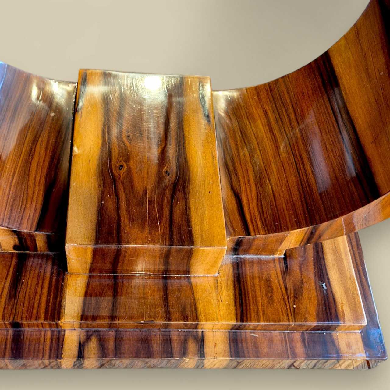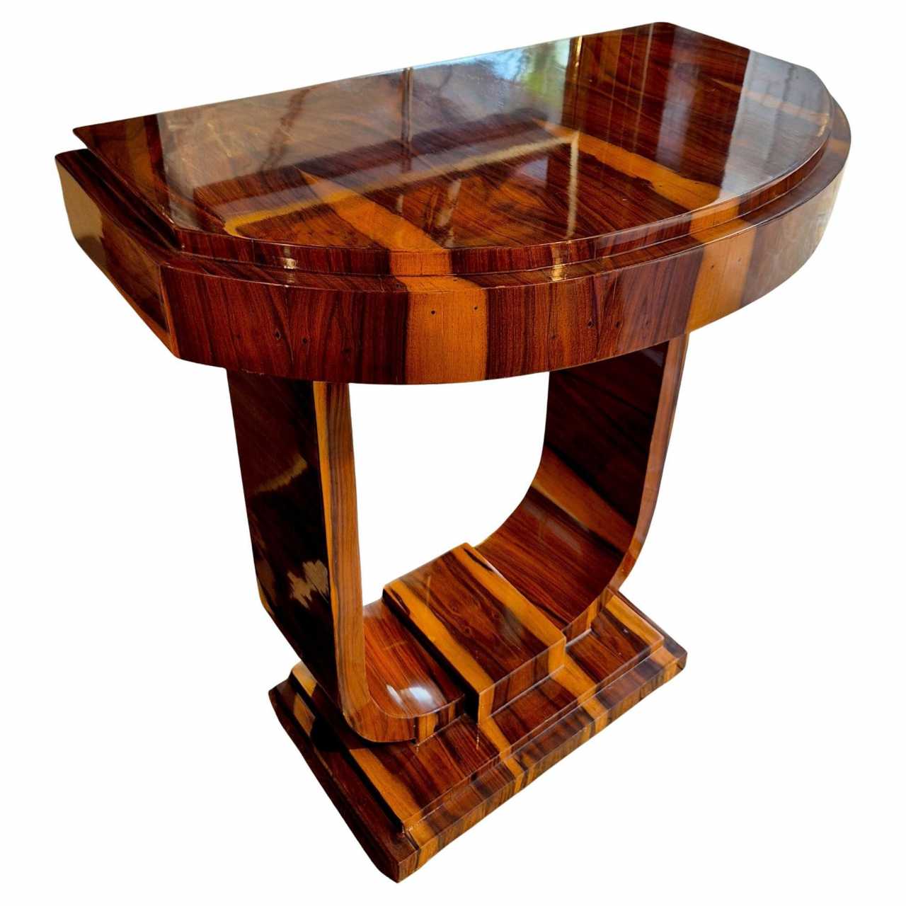 Console de style Art Déco, réalisée en placage de bois exotique, probablement du palissandre ou du palissandre, soigneusement sélectionné pour son veinage spectaculaire et son contraste naturel. Cette pièce présente une structure architecturale typique du mouvement Art Déco, avec des lignes géométriques audacieuses et une élégante symétrie. Son piètement en U inversé repose sur un socle à plusieurs niveaux, conférant à l&39;ensemble une allure sculpturale et équilibrée. Le plateau en demi-lune est souligné par un bord discret et raffiné, parfaitement intégré au design général. La finition brillante sublime la richesse du bois et témoigne d&39;un savoir-faire méticuleux, probablement réalisé au vernis au tampon, comme c&39;était courant à l&39;époque. Cette pièce incarne l&39;esprit du luxe discret et met en valeur le savoir-faire raffiné des années 1930. Idéale dans une entrée, un salon ou un couloir, elle apportera une touche d&39;élégance intemporelle à tout intérieur classique ou contemporain.