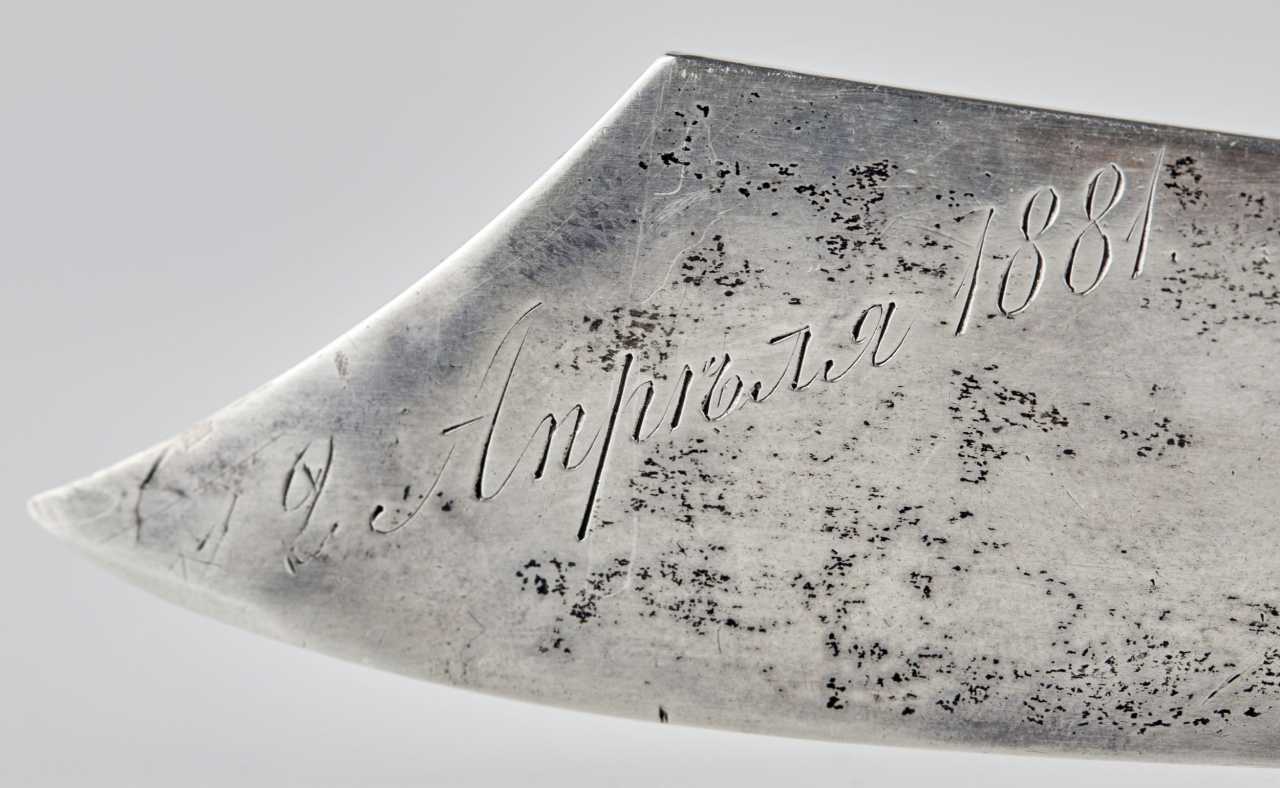 Original dans l`intrigue et la presentation, coupe-papier Faberge en argent, dernier quart du XIXe siècle. Dont le manche est une figure de paysan coupant une bûche, et la lame est un arbre aminci sous son travail. La base plate des racines fonctionne simultanement comme un piedestal, permettant au couteau d`être affiche verticalement et considere comme un objet artistique et un element de bureau attrayant. Poinçon Faberge complet sur la lame du couteau. Moscou 84 echantillons d`argent du dernier quart du 19ème siècle. Longueur du couteau : 21,5 cm Poids : 228 gr.