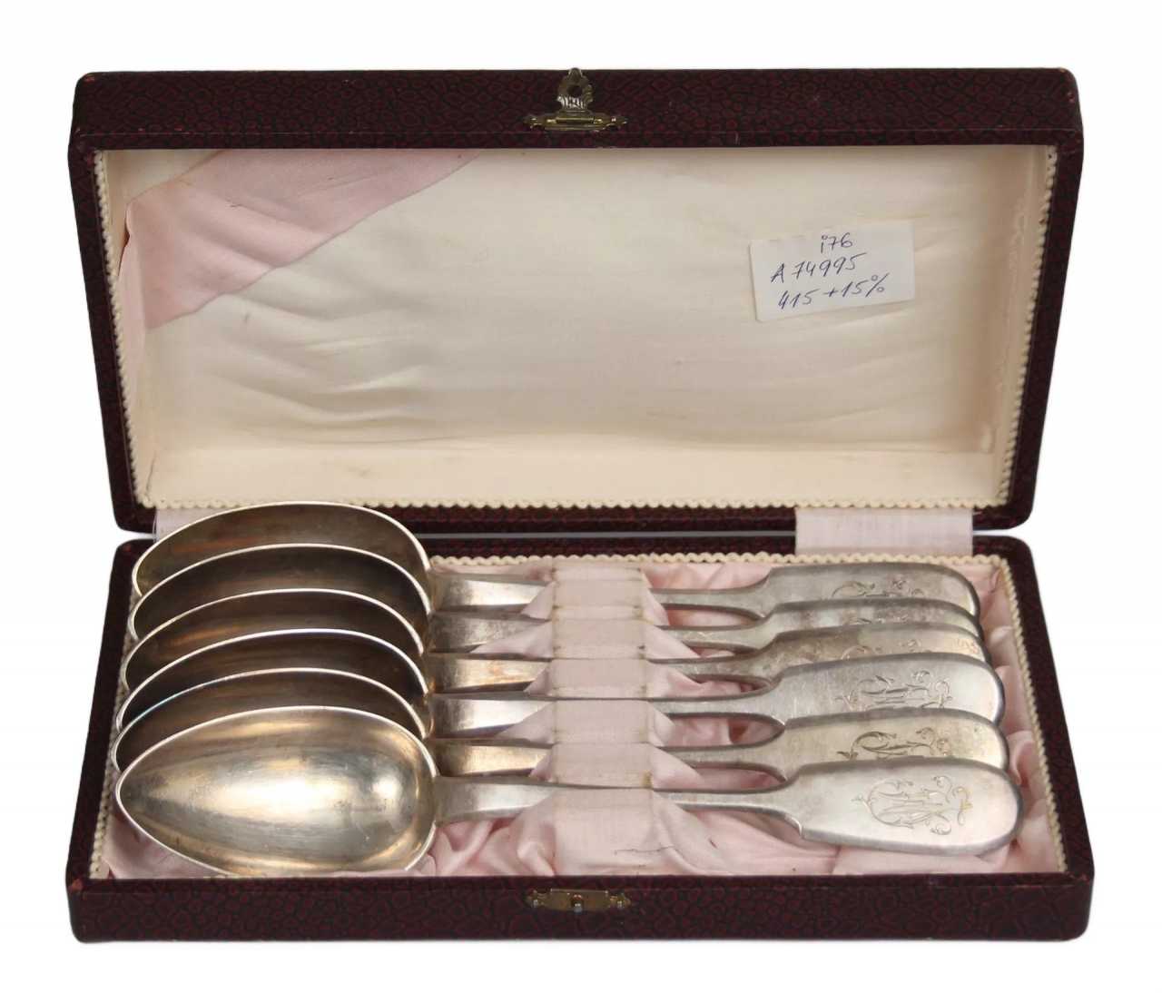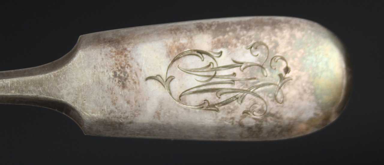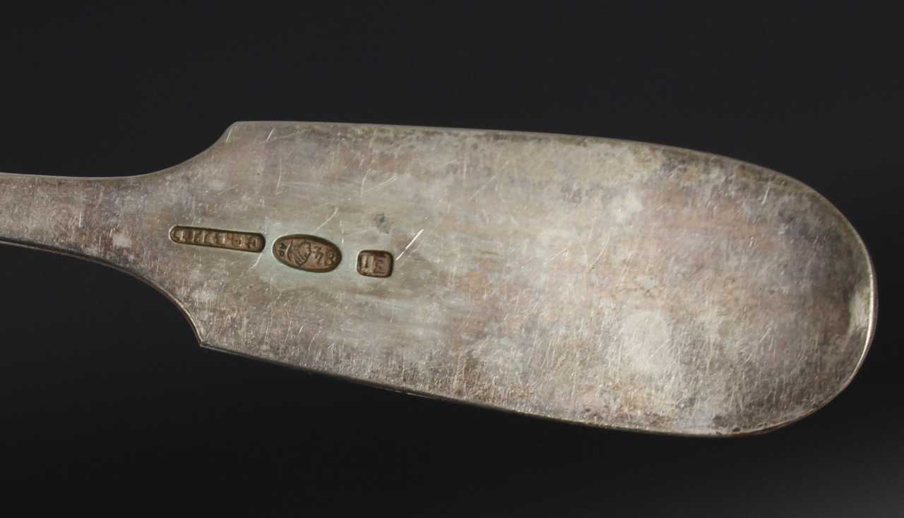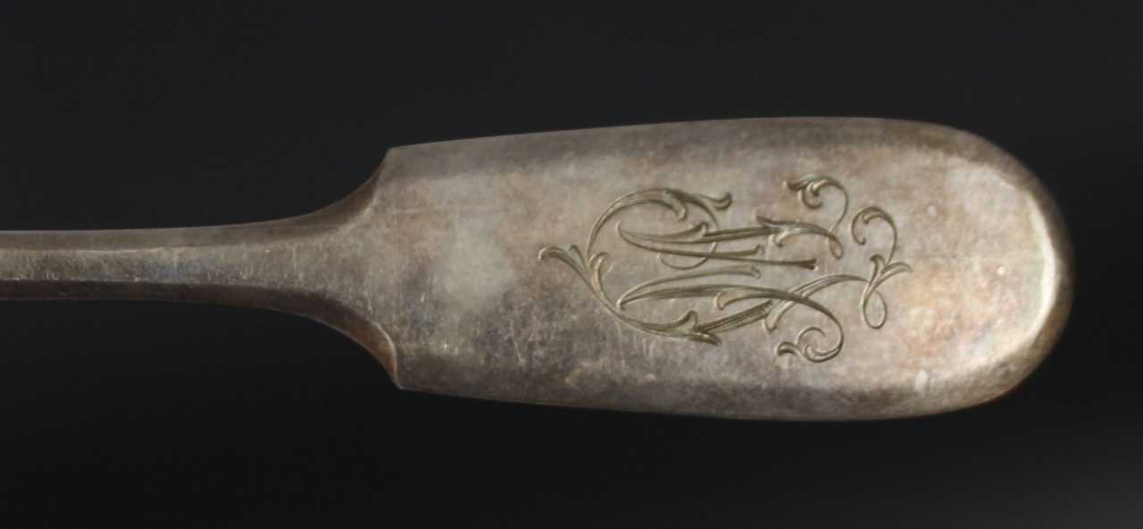 Initiales ЕП, С.П. БУРГь. Argent, épreuve 84. Poids total 414,47, longueur 21,5 cm, avec une gravure.