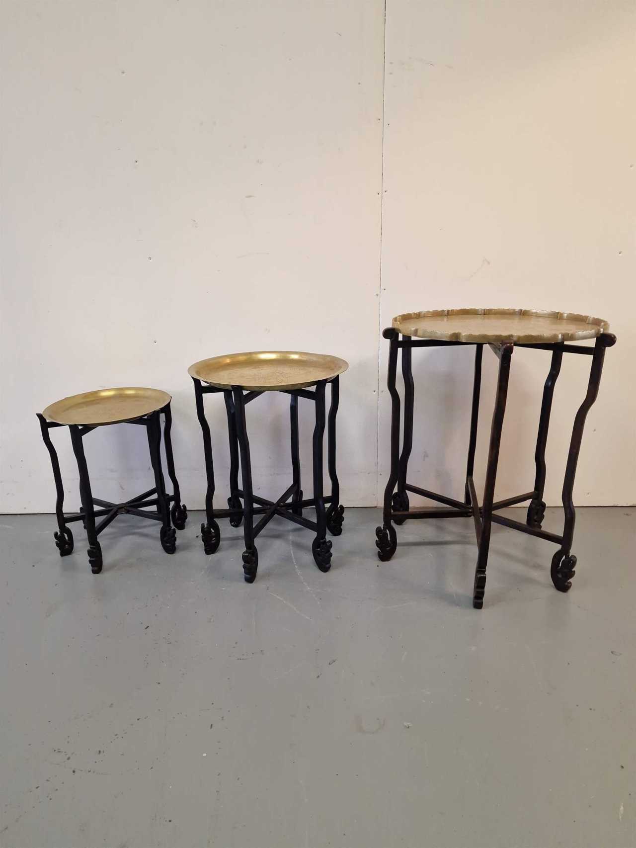 Set of 3 oriental style tables.Wood, brass.China.1950s.Largest table size: height 58cm; diameter 46cm