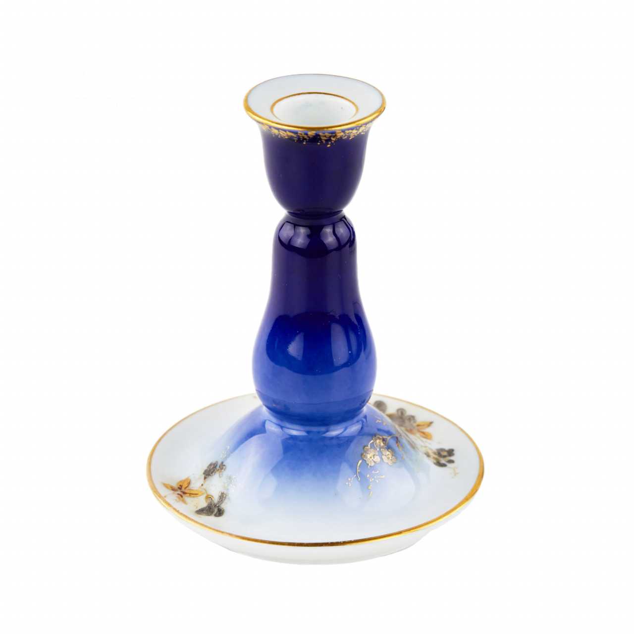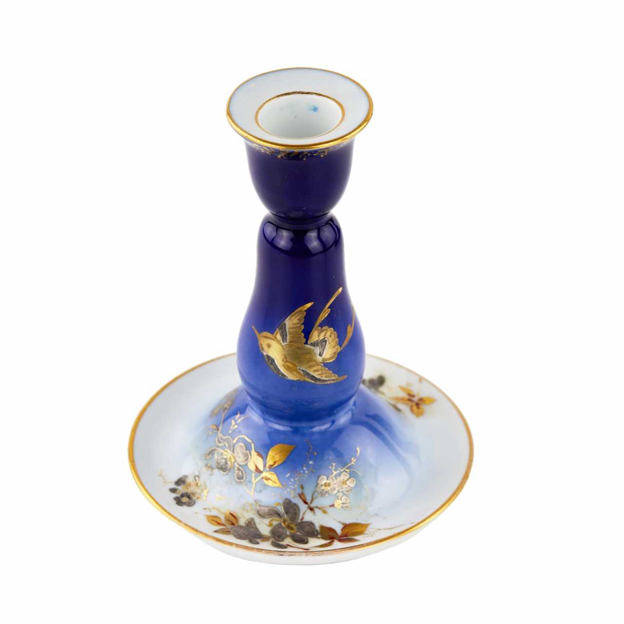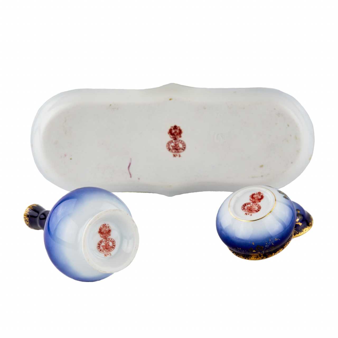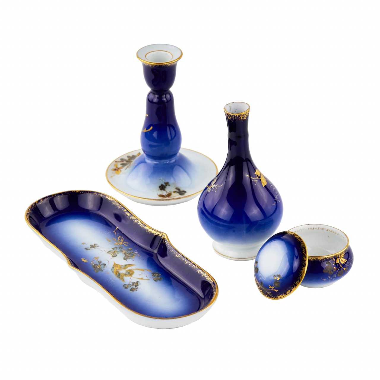 Ensemble de quatre pièces, usine de porcelaine Gardner. Un coin de dames particulier de la fin du 19e siècle, dans le style du debut de la modernite. Comprend : boîte et vase sur plateau et bougeoir autoportant. Allie formes historicistes et decor Art nouveau dynamique. Tous les articles sont marques par l`usine Gardner. Il y a encore un tampon dans la pâte sur le plateau. Hauteur du bougeoir : 14 cm Longueur du plateau : 23 cm.
